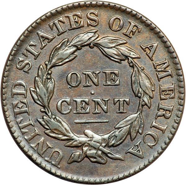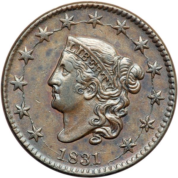 1831 N-12 R1 EF40. Double Profile. EF-40. Glossy chocolate and medium brown with small splashes of slightly darker olive brown scattered about the obverse and frosty luster in some protected areas. A tiny horizontal hairline under the stem tip is the best identifying mark. E-MDS. The obverse die cracks are stronger but the radial die crack from star 13 to the dentils has not formed. A clear double profile extends from the forehead down to the bottom of the neck (caused by die bounce). DWH #0783.