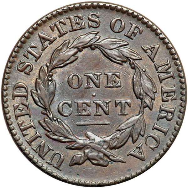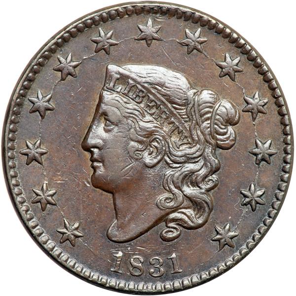 1831 N-12 R1 EF45. EF-45. Glossy chocolate brown with delicate overtones of bluish steel in the obverse fields and frosty lighter steel brown in protected areas of the reverse. A few tiny nicks on the jawline, a small nick in the field close off the chin, and a few tiny hairline scratches over the E in ONE. EDS, but not quite the earliest. The obverse fields are smooth and slightly reflective thanks to a fresh die polishing. The obverse die cracks from the earlier N-11 marriage are light, but a fine die crack now connects the outer point of star 4 to the dentils and the crack from star 13 into the field near the date has an extension down to the dentils. DWH #0782.