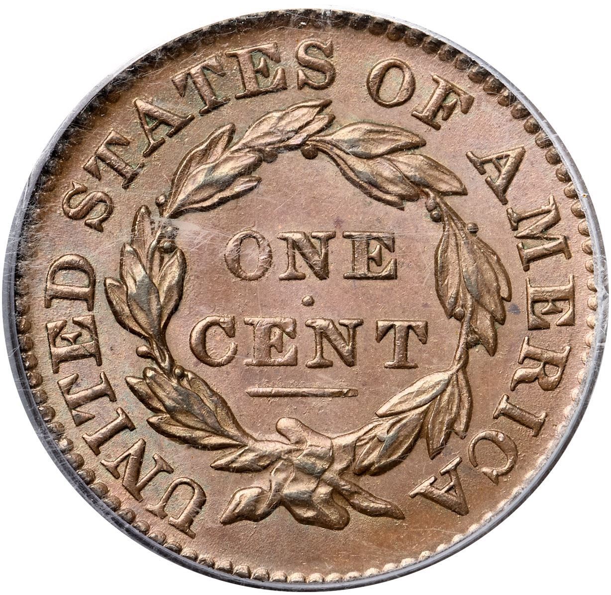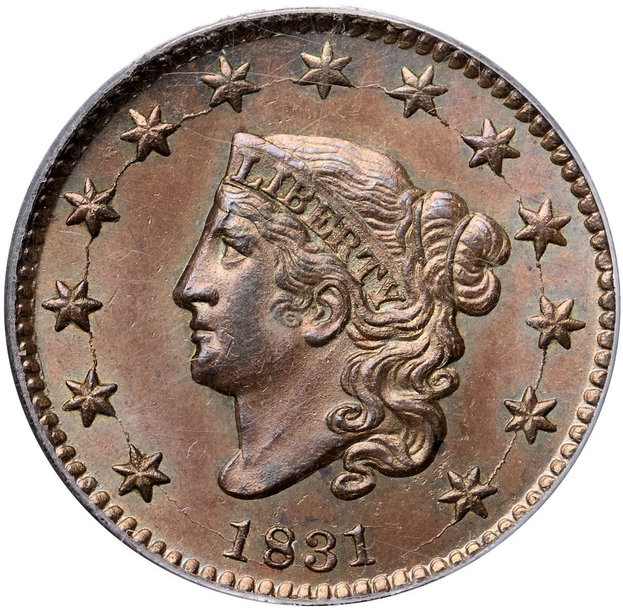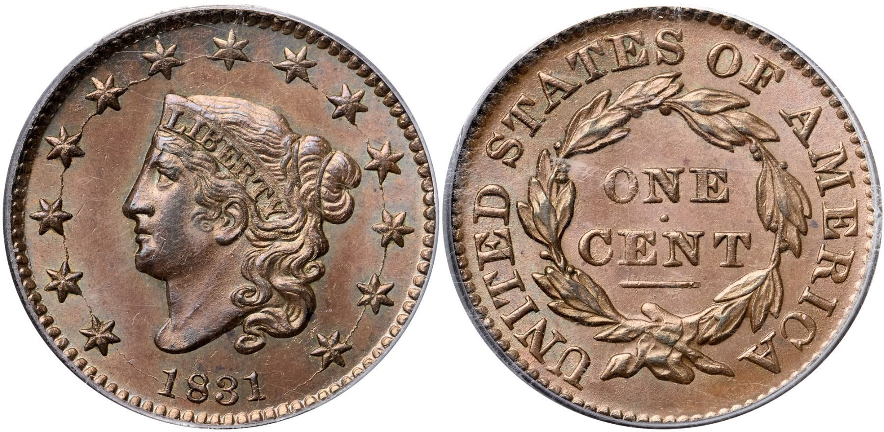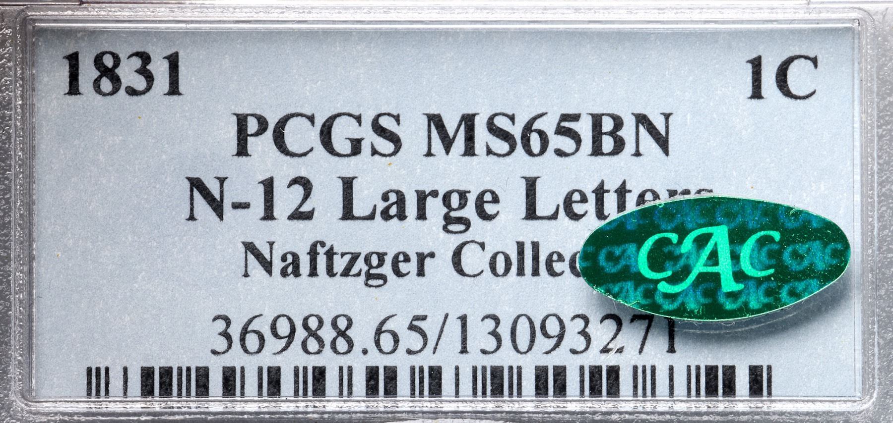 1831 N-12 R1 Large Letters, PCGS graded MS65 Brown, CAC ApprovedHighly lustrous light bluish steel brown. The surfaces are satiny and this cent has great eye appeal. Just a few minor marks including a dull nick on the chin, another on the brow lock, and a couple faint spots of darker toning on the lower edge of the bust. EDS+, die state c, with a fine radial die crack to the dentils from the outer point of star 4 and another from the end of the crack right of the date down to the dentils. The obverse fields are hard and very slightly reflective while fine die rust is evident on the reverse (even though this is supposed to be the first marriage for the reverse die, it never looks new with perfectly smooth fields). This was the earliest die state Ted Naftzger was able to find in nice condition. Called MS63 and tied for CC#1 in the Bland census. Noyes says MS60 and tied for CC#6, his photo #21790. Our grade is MS63.Certificate Number: 36988.65/13093271Pedigree: Ex Robert J. Kissner, New Netherlands Coin Co. #44, 6/1954:422-Emanuel Taylor 10/1960-R. E. "Ted" Naftzger, Jr.-Naftzger Estate, McCawley & Grellman Auctions/Goldbergs 2/1/2009:263-Terry S. Denman Collection