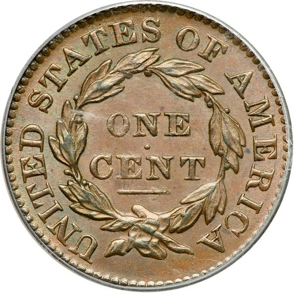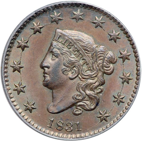 1831 N-12 R1. PCGS graded MS-65 Brown. Large Letters Reverse. Highly lustrous light bluish steel brown with bluish steel overtones in protected areas on the obverse. Great eye appeal, just a couple trivial marks from flawless. The notable flaws are a dull contact mark on the browlock and a couple faint spots of darker toning on the lower edge of the bust. EDS but not quite the earliest state (although this is the earliest state Ted was able to acquire). There is a fine radial die crack to the dentils from the outer point of star 4 and from the end of the crack right of the date down to the dentils. The obverse fields are hard and very slightly reflective while fine die rust is evident on the reverse (even though this is supposed to be the first marriage for the reverse die, it never looks new with perfectly smooth fields). Called MS63 and tied for CC#1 in the Bland census. Noyes says MS60 and tied for CC#6, his photo #21790. Our grade is MS63. The attribution and Naftzger provenance are noted on the PCGS label and the Naftzger collection envelope is included. PCGS population 3; none finer.