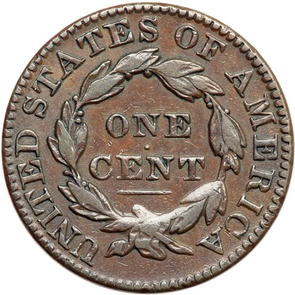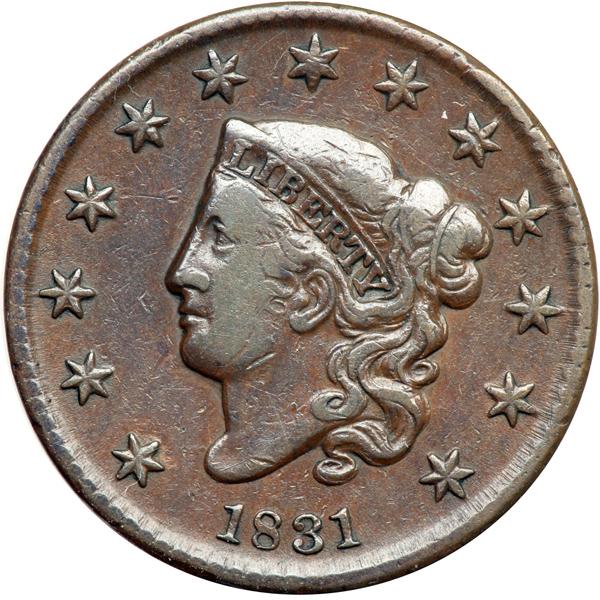 1831 N-14 R4- VF25. VF-25. Nice glossy medium brown and chocolate. A thin nick along the center of the jawline is the notable mark. EDS. The reverse fields are smooth while the obverse fields are covered with fine radial die flowlines from the earlier N-10 marriage, but they are not strong. The rim cud at star 9 from the earlier N-10 marriage is visible. DWH #0793.