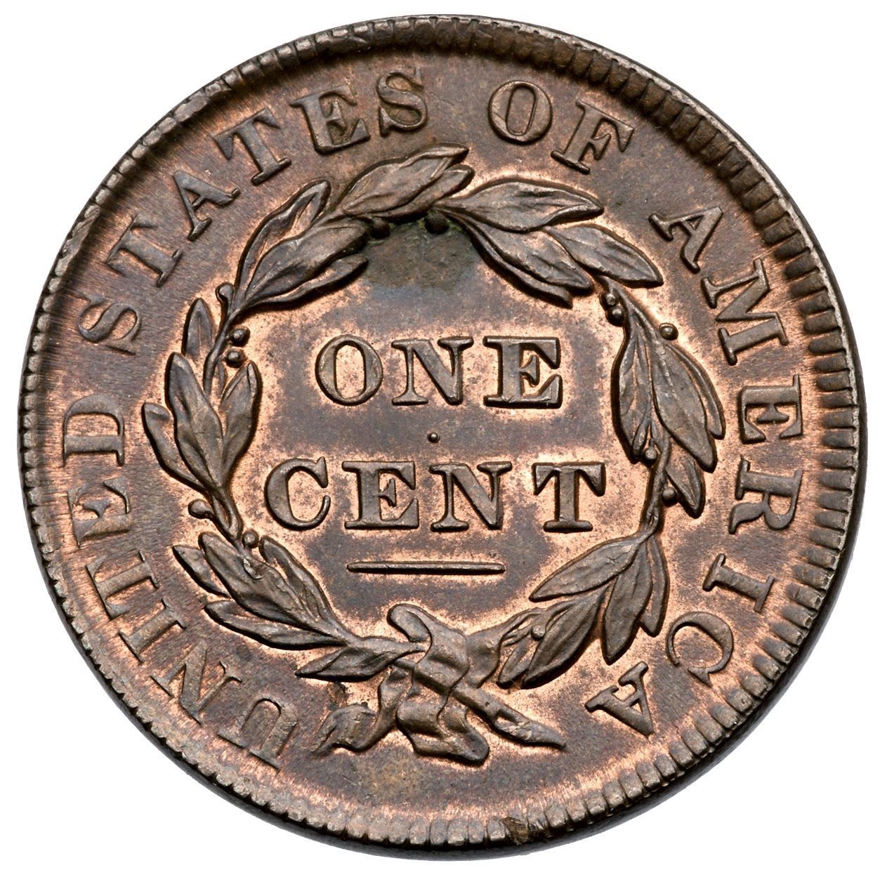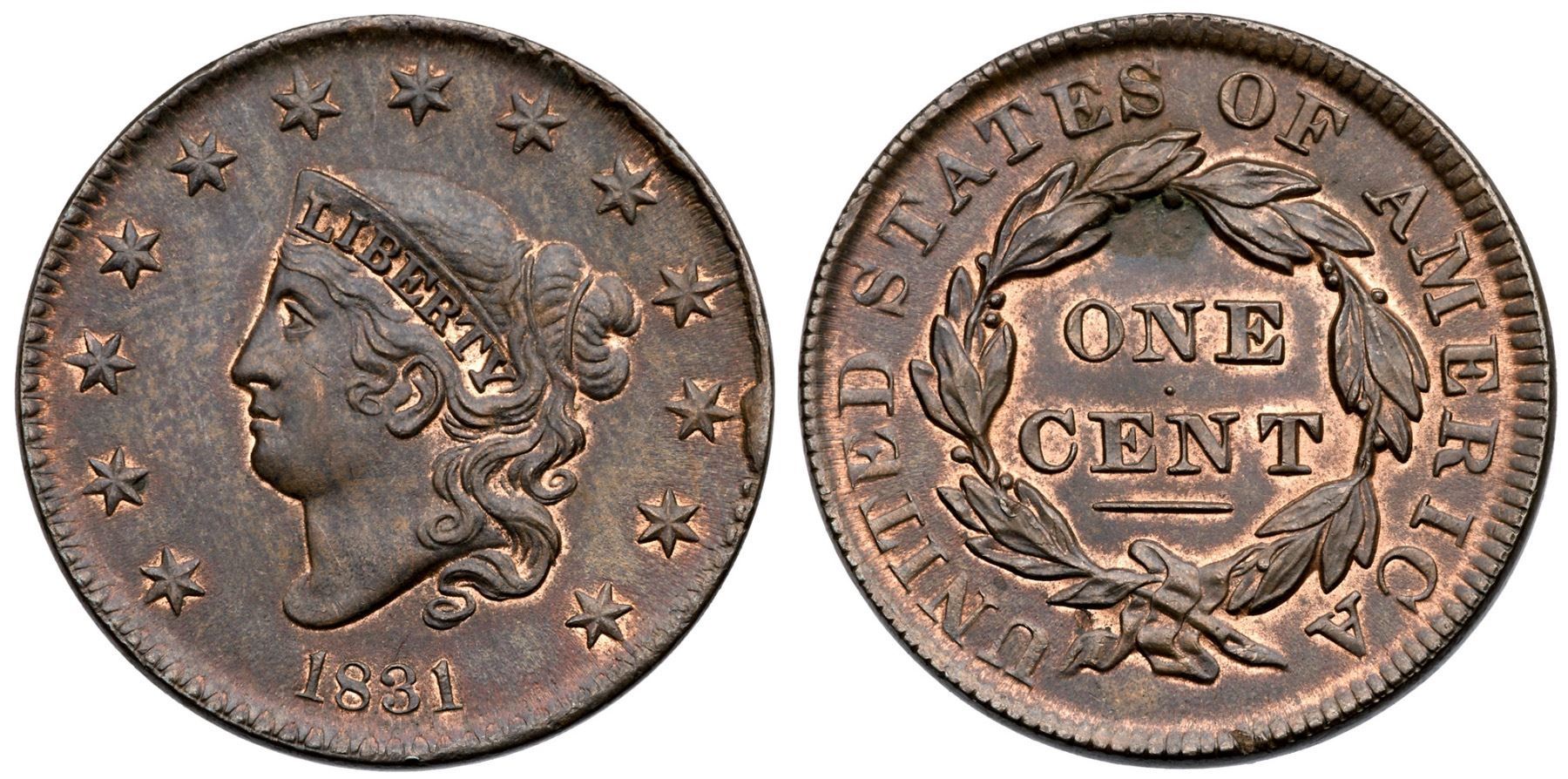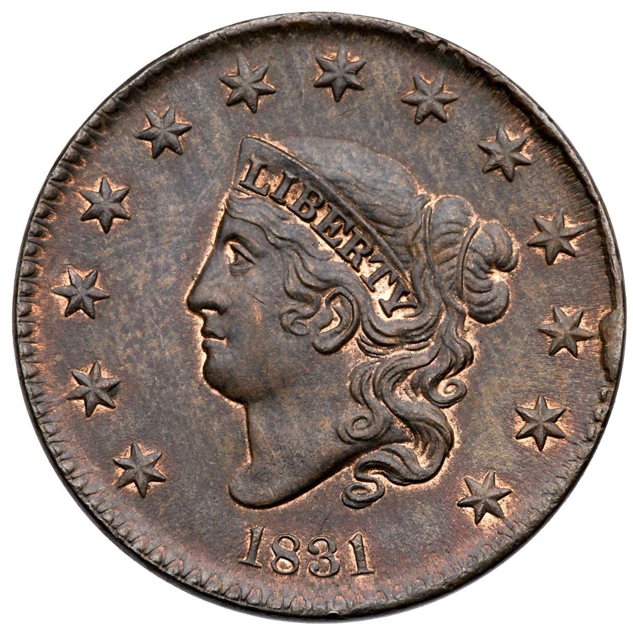 1831 N-2 R2+ Medium Letters MS60Lustrous olive and steel brown with at least 5% of the original mint red showing, mostly on the reverse. Satiny and choice if not for subtle traces of an old fingerprint in the field before the portrait and a patch of very light verdigris nestled into the berries above the N in ONE. Neither defect catches your eye and this cent has excellent eye appeal. LDS, die state c, with a cud break at star 11 that nearly touches the outer point of the star. A very nice example of this scarce die state.Certificate Number: Pedigree: Ex Anthony J. Terranova 4/19/2012-Terry S. Denman Collection