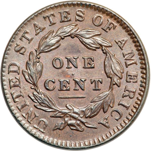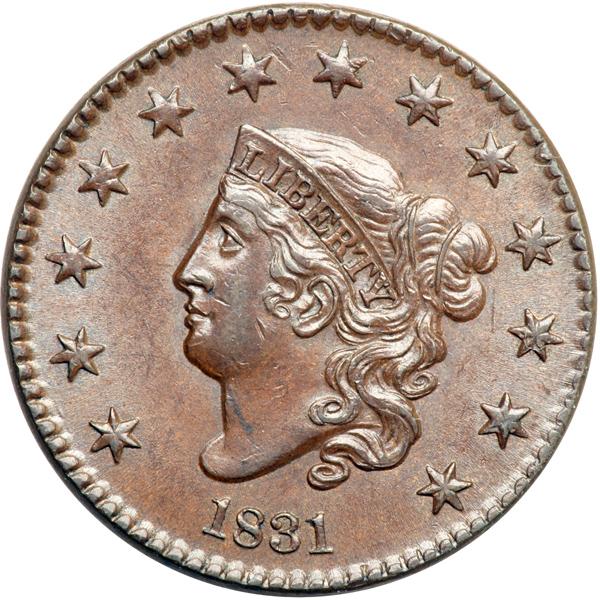 1831 N-3 R1 AU55. Small Letters Reverse. PCGS graded MS-64 Brown. Lustrous steel brown with delicate overtones of bluish steel in protected areas and a few peeps of faded mint red on the reverse. The best identifying mark is a thin swipe of darker olive toning on the neck. MDS. The fields show fine radial die flowlines and there is some strike doubling on the nostril and lips, but the doubling isn't extensive enough to justify calling this cent a "double profile." The reverse is rotated 15 degrees CCW. A sharp, attractive cent. Our grade is AU55. Pop 3; 1 in 65. DWH #0752.