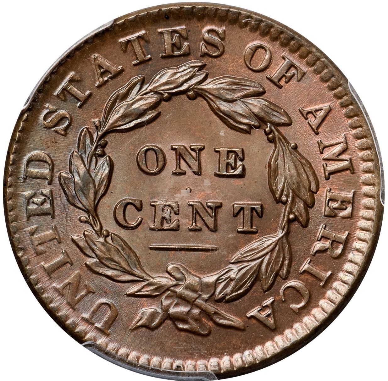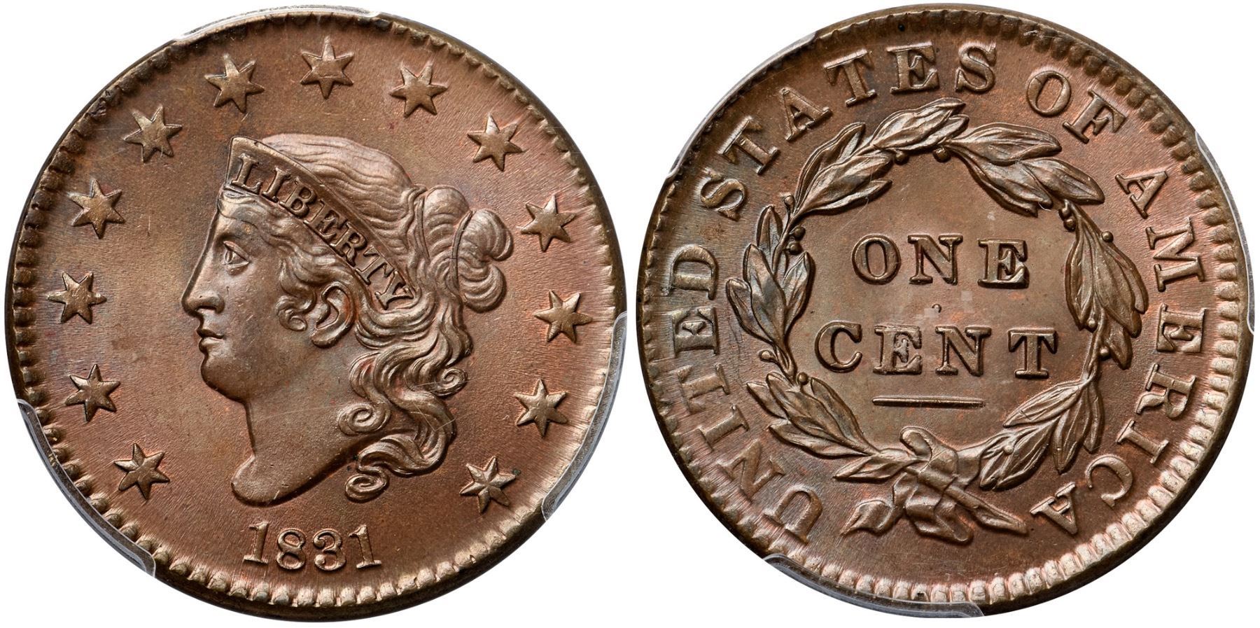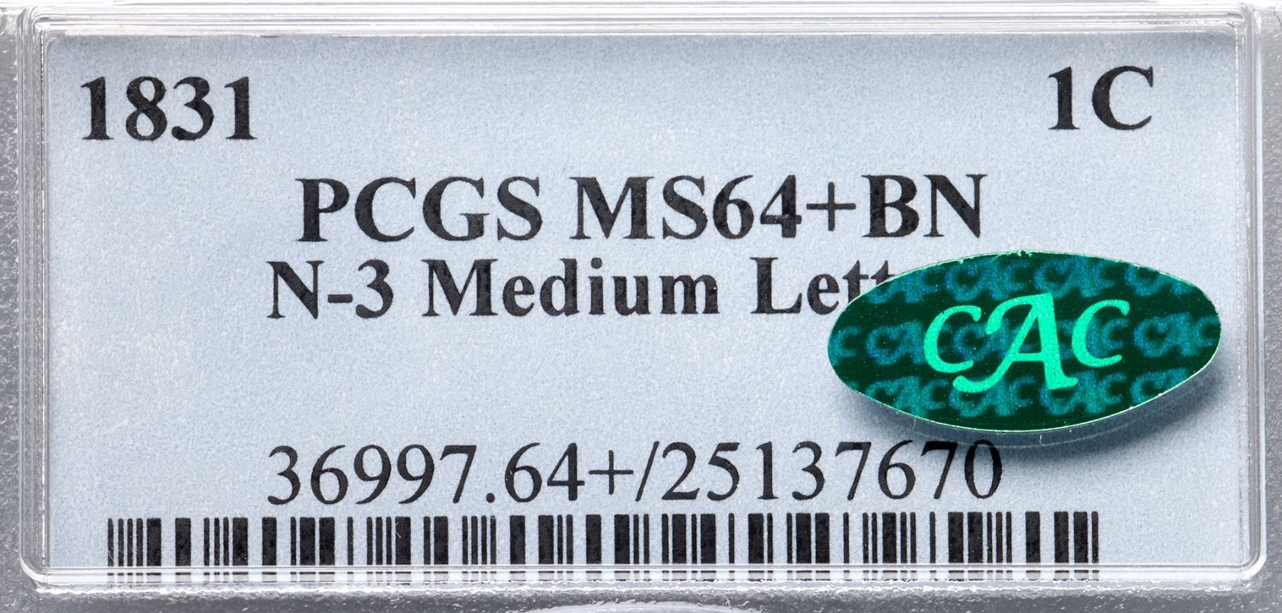 1831 N-3 R1 Medium Letters, PCGS graded MS64+ Brown, CAC ApprovedLustrous light steel brown with subtle overtones of light bluish steel. Hints of faded mint color are bleeding through the delicate toning on both sides. Satiny mint frost covers the planchet and this cent has great eye appeal. The only marks, and they are barely visible, are a couple of small spots of lighter reddish tan toning at the ear and in the hair below plus a tiny rim nick at the bottom of the reverse. MDS. Called MS62 and CC#9 in the Noyes census, his photo #56022. Our grade is MS63.Certificate Number: 36997.64+25137670Pedigree: Ex Chris McCawley FPL #69, 1/2002-Paul Gerrie, McCawley & Grellman Auctions/Goldbergs 5/27/2012:33-Harry Laibstain 2013-Terry S. Denman Collection