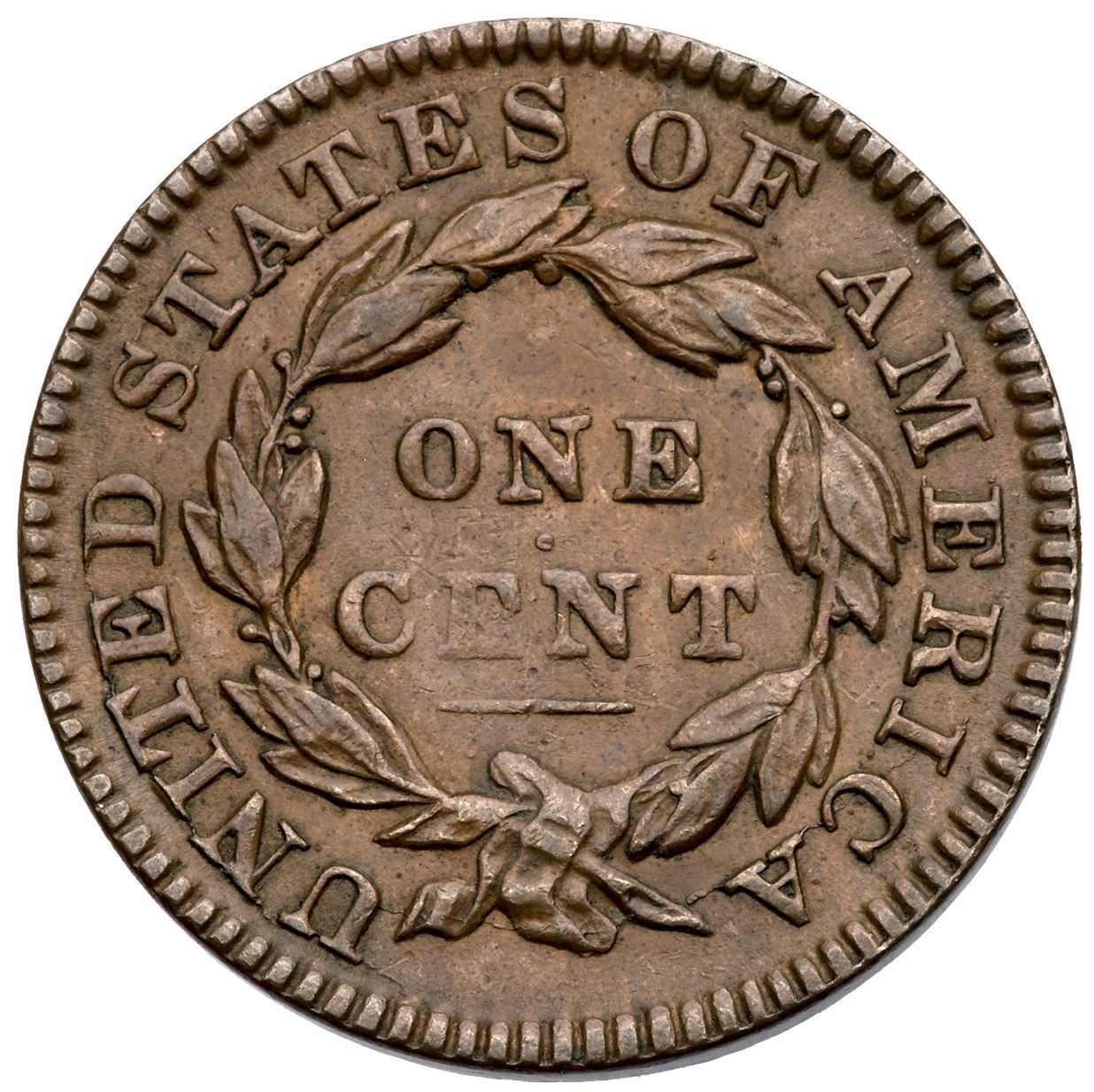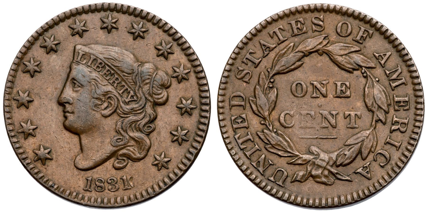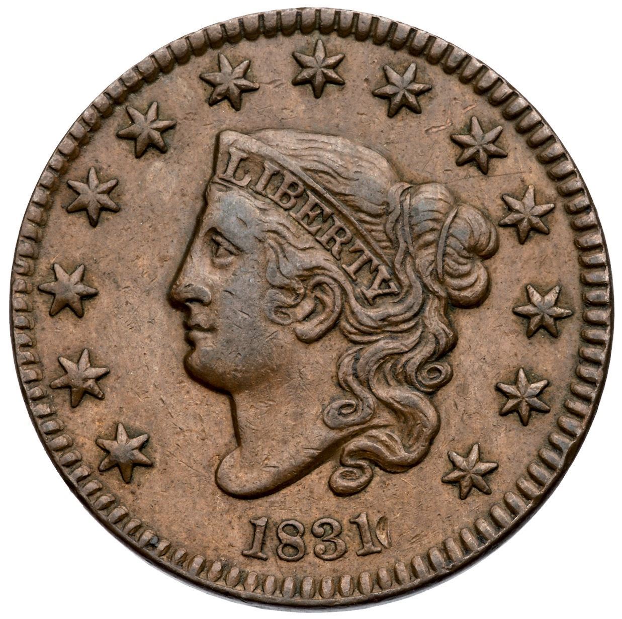 1831 N-4 R4 Medium Letters VF35+Slightly sharper but there are some small contact marks on otherwise smooth, attractive surfaces. The notable marks are a dull nick just right of the date and a couple tiny scratches over star 9. Glossy medium brown and light chocolate with lighter brown in the fields and protected areas, especially on the reverse. Sharply struck with exception of some weakness at CE, as usual for this variety. EDS, die state a, with smooth fields and an uncracked obverse. A nice example of a variety that is difficult to find in grades above VF.Certificate Number: Pedigree: Ex Chris McCawley 5/2/2013-Terry S. Denman Collection