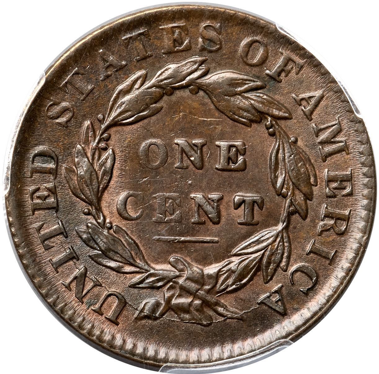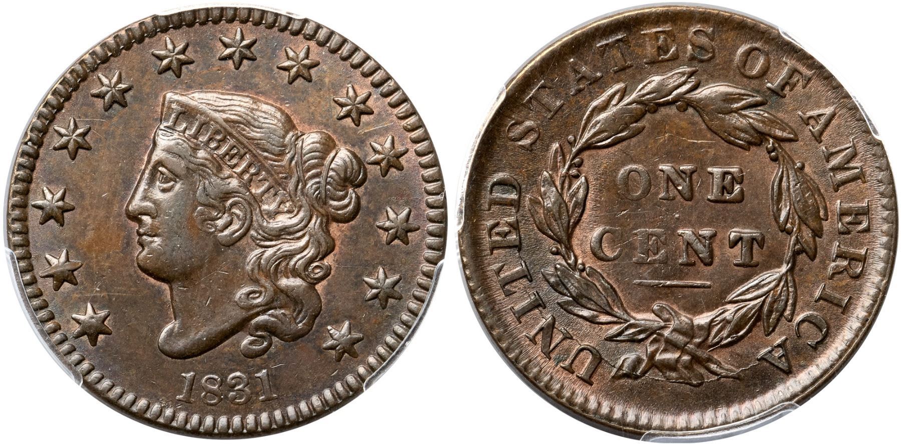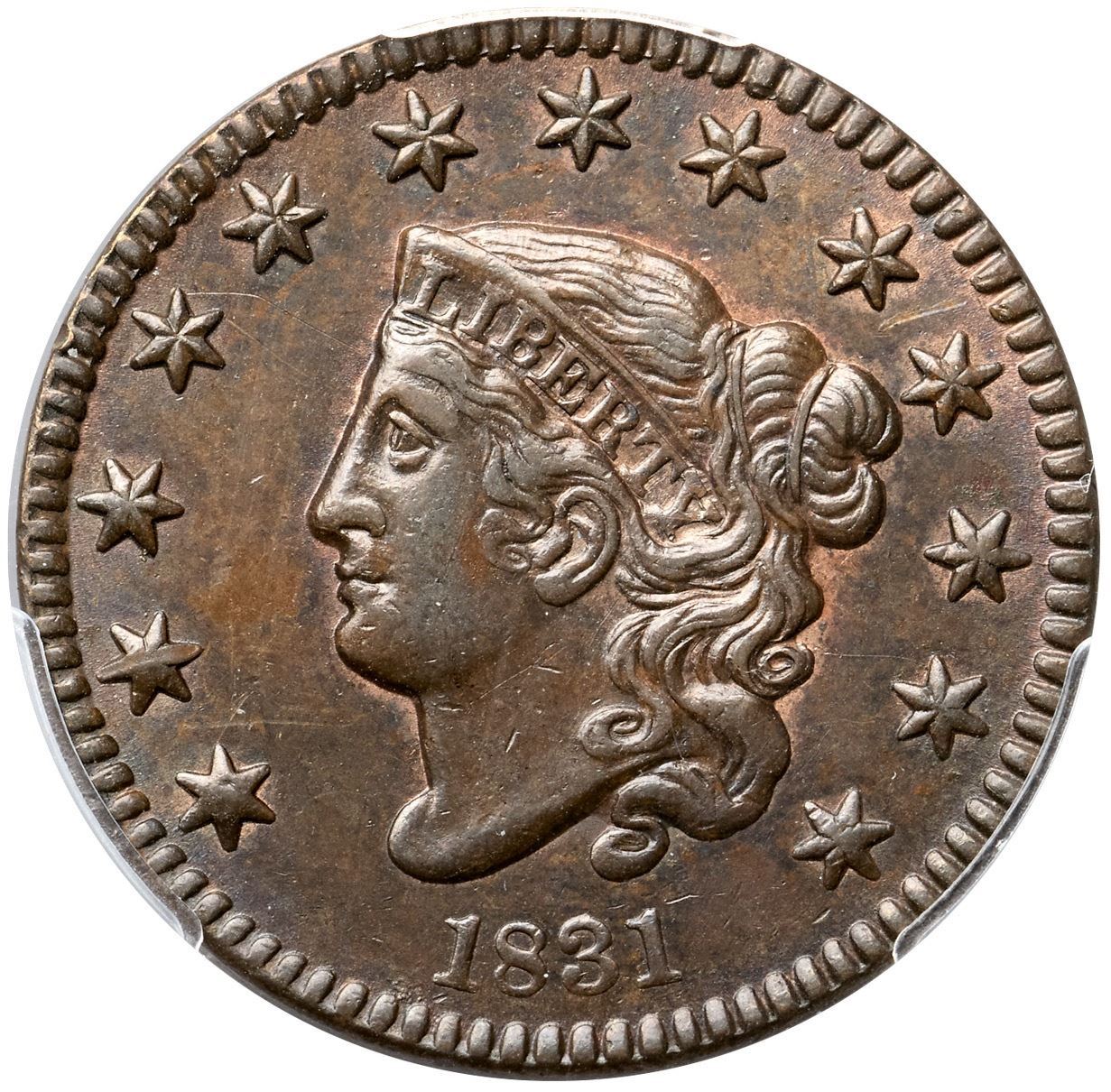 1831 N-5 R4 Medium Letters, PCGS graded MS63 BrownVery attractive glossy chocolate brown and olive with traces of very faded mint red showing in protected areas on both sides. The surfaces are smooth, free of any spots or stains, and the eye appeal of this cent is outstanding. The only notable marks are two very fine hairline scratches in the field before the forehead, another between stars 9 & 10, and a small horizontal scratch over the right side of the N in ONE. E-MDS with extremely fine radial die flowlines in slightly reflective obverse fields. Graded EF45 net EF40 and tied for CC#3 in the Noyes census, his photo #34034. Bland says AU50 and finest known among the confirmed examples in his census. Our grade is EF45+, close to AU50. This is a very important example of a variety that is unknown in mint state (by EAC grading standards).Certificate Number: 37003.63/83245086Pedigree: Ex John Dammer 9/26/1996-Jack H. Beymer-Robert E. Vail, Superior 9/7/1997:503 (as AU50)-Manuel Ahumada Collection, McCawley & Grellman Auctions/Goldbergs 6/4/2017:116-Terry S. Denman Collection