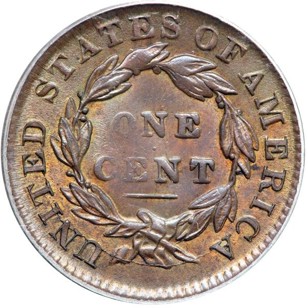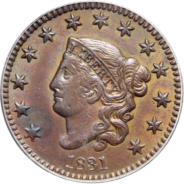 1831 N-5 R4 PCGS graded MS62 Brown. Small Letters Reverse. PCGS graded MS-62 Brown. Lightly cleaned and nicely retoned glossy chocolate with lustrous lighter golden brown toning covering the protected areas. An area of darker olive and chocolate brown toning is located in the field at the top of star 1. A small planchet chip (as struck) shows on the jaw and there are a few tiny ticks elsewhere on the cheek and neck. MDS. The obverse fields are covered with microscopic die flowlines and are satiny rather than prooflike as seen in the early state. The always-present die crack through the legend outside the wreath and a small patch of fine die rust (lumps on the coin) at the dentil tips just left of the date are clear. Called AU50 net EF45 and tied for CC#1 in the Bland census. Noyes says AU55 net EF40 and tied for CC#3, his photo #21485. Our grade is EF45. Pop 1; The finest graded at PCGS for the variety. The other example grades VF30. DWH #3541.