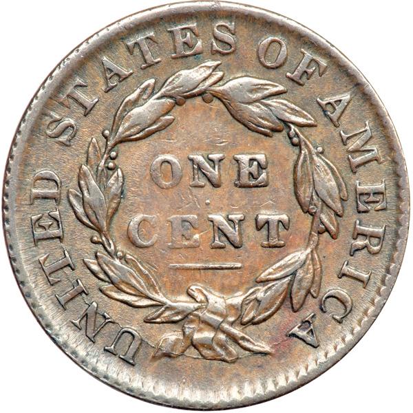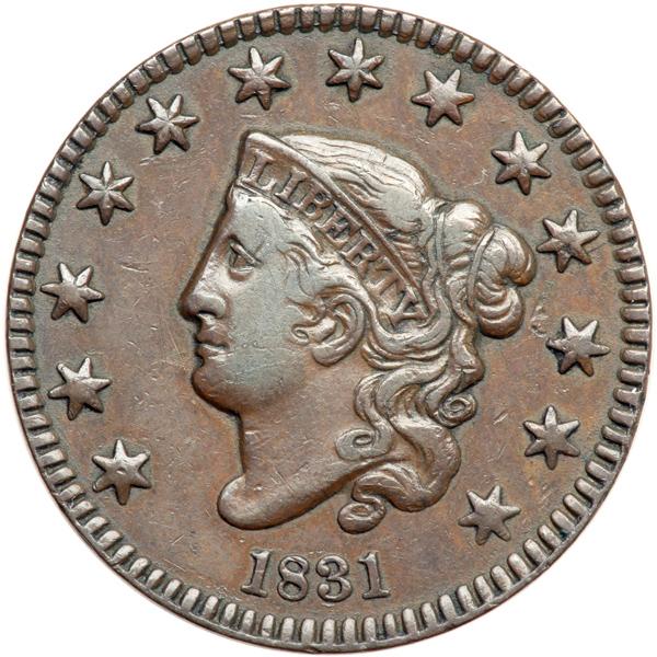 1831 N-5 R4 VF30. Small Letters Reverse. VF-30. Glossy chocolate brown, a shade or two darker on the highpoints than in the protected areas. The surfaces are smooth and the only marks are a nick left of star 11 and a couple very light hairline scratches in the field before the lips. Excellent eye appeal for the grade. EDS with sharp dentils around the obverse and hard, slightly reflective fields on that side. The reverse die is well worn, as always, from use in the earlier (yes, earlier) 1832 N-1 marriage. DWH #2647.