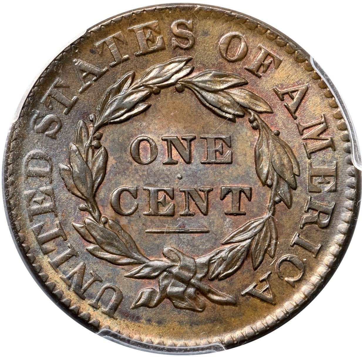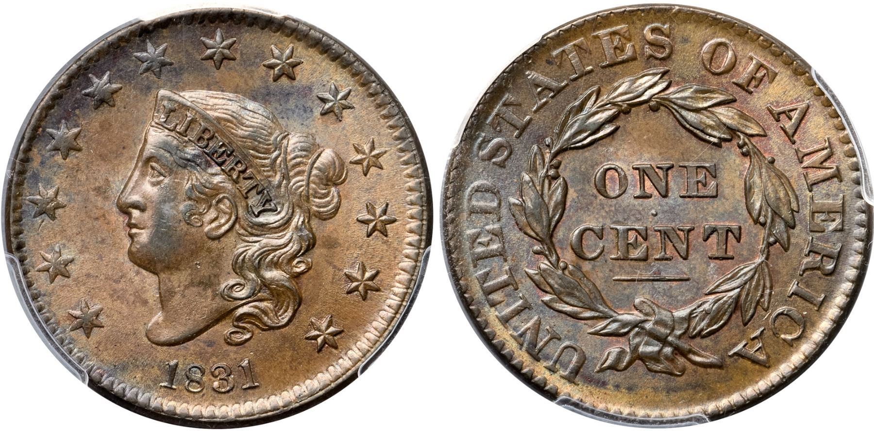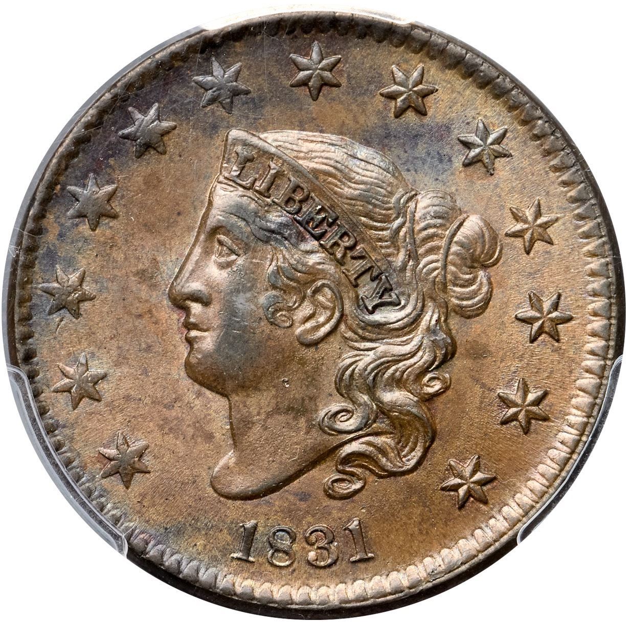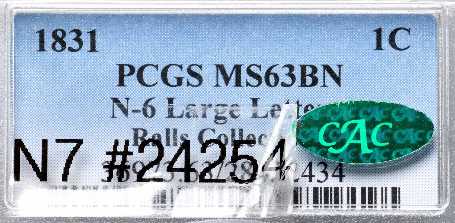 1831 N-7 R1 Large Letters, PCGS graded MS63 Brown, CAC ApprovedFrosty light to medium brown with slightly darker steel brown on the highpoints. Traces of faded mint red show in protected areas, especially on the reverse. A swipe of darker bluish steel and olive toning at stars 3-7 is the best identifying mark. LDS, die state b. Fine radial die flowlines cover the fields and crumbling fills the notch on the right side of the R in AMERICA. The PCGS label says this piece is N-6, but it is N-7. Called MS60+ by Del Bland. Noyes says MS60 and tied for CC#7, his photo #24254. Our grade is MS60. The incorrect N-6 attribution and Ralls Collection provenance are shown on the PCGS label.Certificate Number: 36973.63/28472434Pedigree: Ex C. Douglas Smith-Lou DiLauro 1981-Dr. Philip W. Ralls-Ralls Estate, McCawley & Grellman Auctions/Goldbergs 1/2014:767-Terry S. Denman Collection