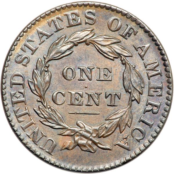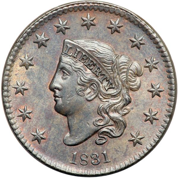1831 N-7 R1 MS60. PCGS graded MS-64 Brown. Lustrous bluish steel brown with faded mint color remaining in protected areas, mostly on the obverse. The surfaces are satiny and free of spots, stains, or other distractions. The best identifying marks, and they are barely visible, are a tiny rim nick at star 12 and a very faint hairline in the field close along the profile of the nose. E-MDS, before crumbling forms in the notch on the right side of the R in AMERICA. Called MS60 and tied for CC#6 in the Noyes census, his photo #25687. Bland says MS60+ and tied for CC#6 in his census. Removed from an NGC slab graded MS65BN (NGC label included). Our grade is MS60. Pop 2; 1 in 65. Only 3 graded at PCGS for the variety. DWH #2613.