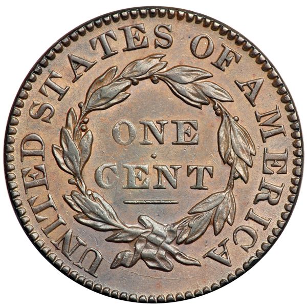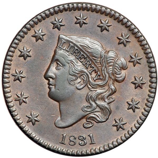 1831 N-8 R3 EF45. Choice frosty steel brown with darker steel brown and chocolate toning on the highpoints and lustrous lighter steel brown in protected areas. A sharp, very attractive cent. Virtually flawless except for a small rim nick at the C in AMERICA. MDS with a fine die crack through the tops of TED-ST and the reverse rotated 25 degrees CCW. Comes with the Wyatt collection pillbox. Holmes #0764.