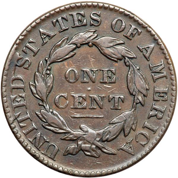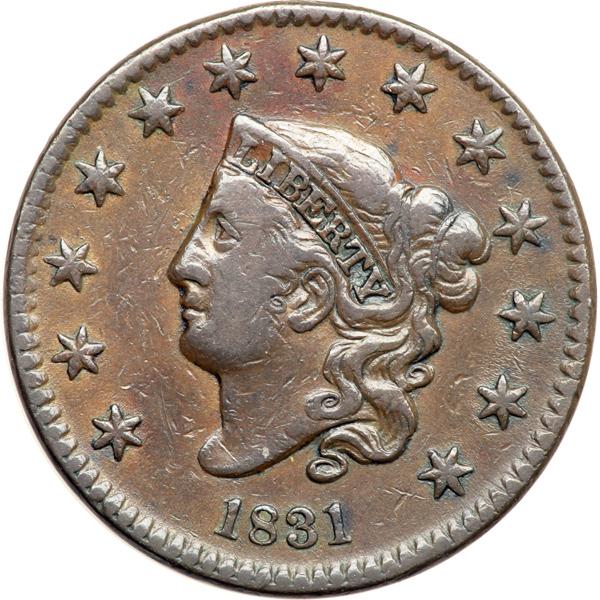 1831 N-8 R3 F15+. Fine-15+. Sharpness VF20 with a few too many tiny contact marks for the higher grade. Glossy medium brown and chocolate with frosty lighter brown toning in protected areas of the obverse. M-LDS with a clearly raised retained cud break over TED-S. An attractive cent, close to VF20. Called VF25 and finest known with the raised retined cud break in the Noyes census, his photo #21080. DWH #3310.