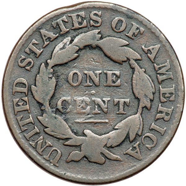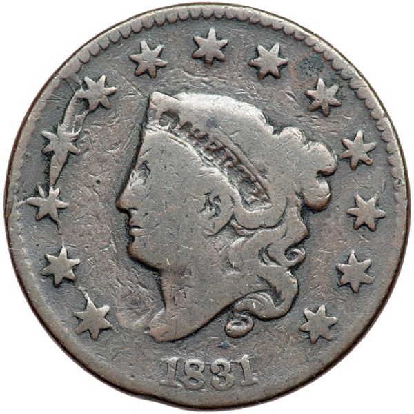1831 N-9 R2 G6. Glossy chocolate brown with darker olive toning in protected areas. There is a bit of fine verdigris at star 9 and a few light scratches inside the wreath, but overall this piece is decent for the grade. Extremely rare late die state with an internal cud break connecting stars 3-5, and the section outside the cud is sunken slightly as a retained cud break. In the terminal state, the internal cud is fully raised under star 5 while that area is only partially raised on this example. In addition, there is a small planchet clip affecting the dentils under the first 1 in the date and the opposing ones over the E in STATES. Noyes photo #34473. Holmes #1889.