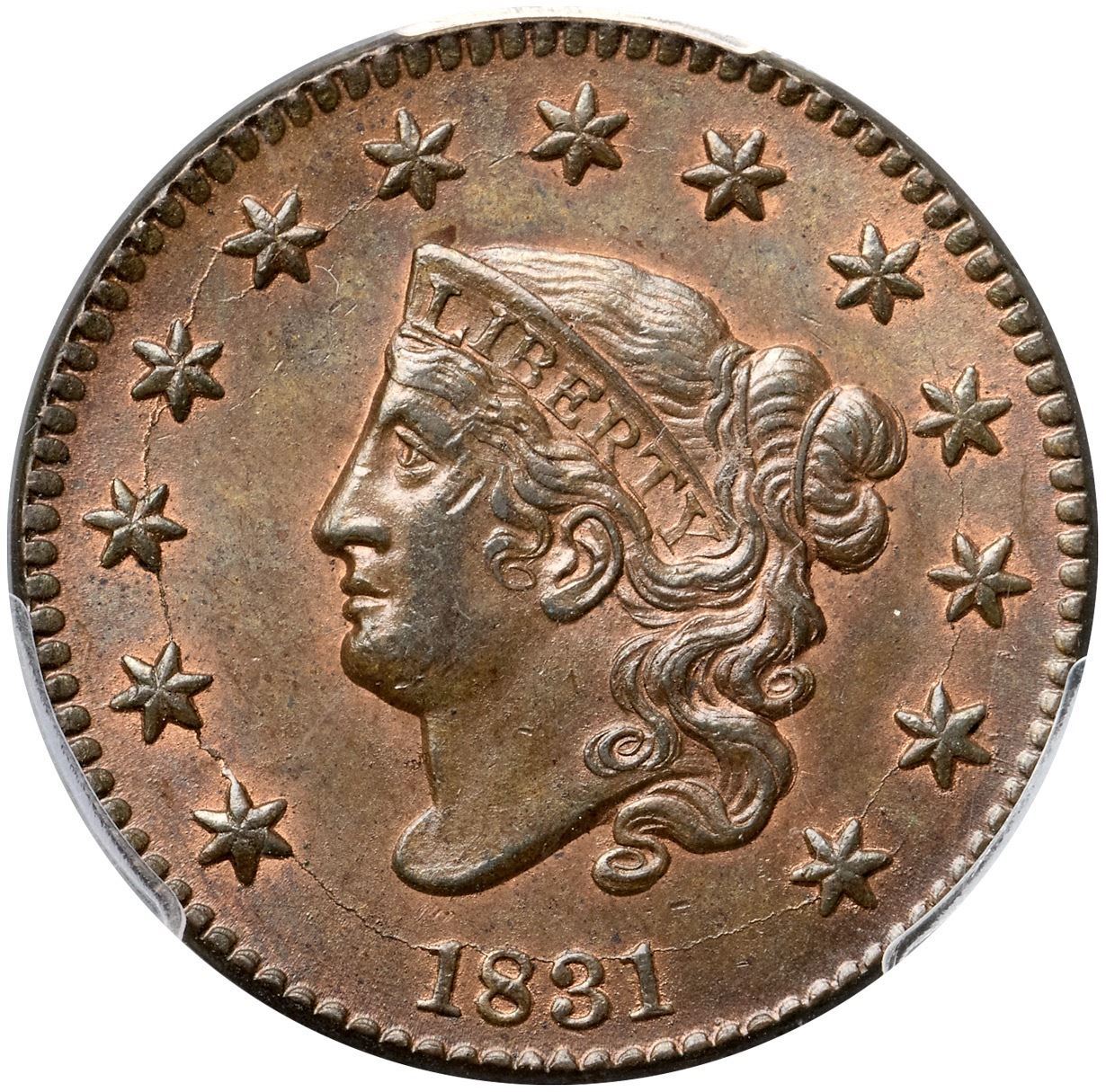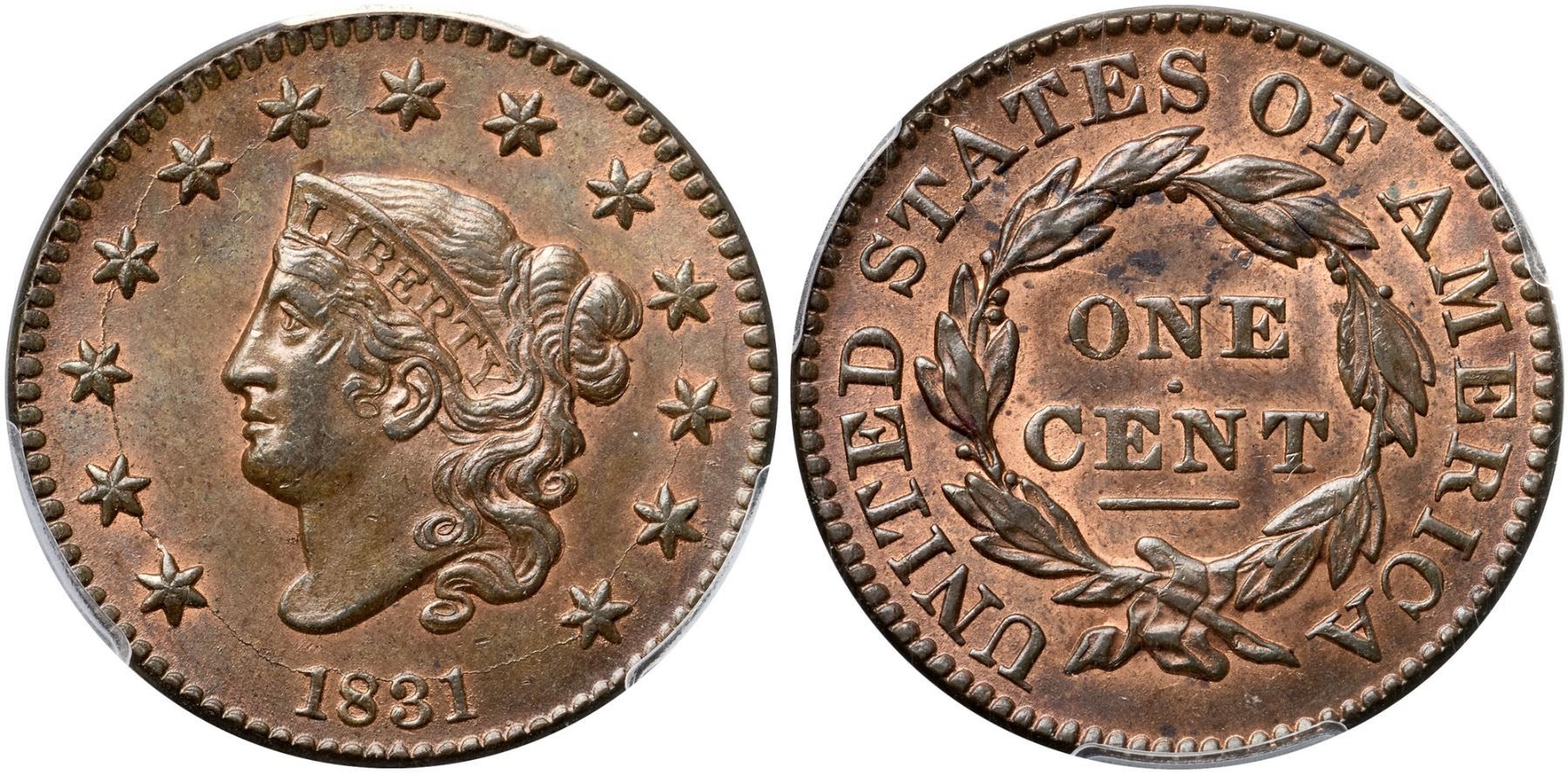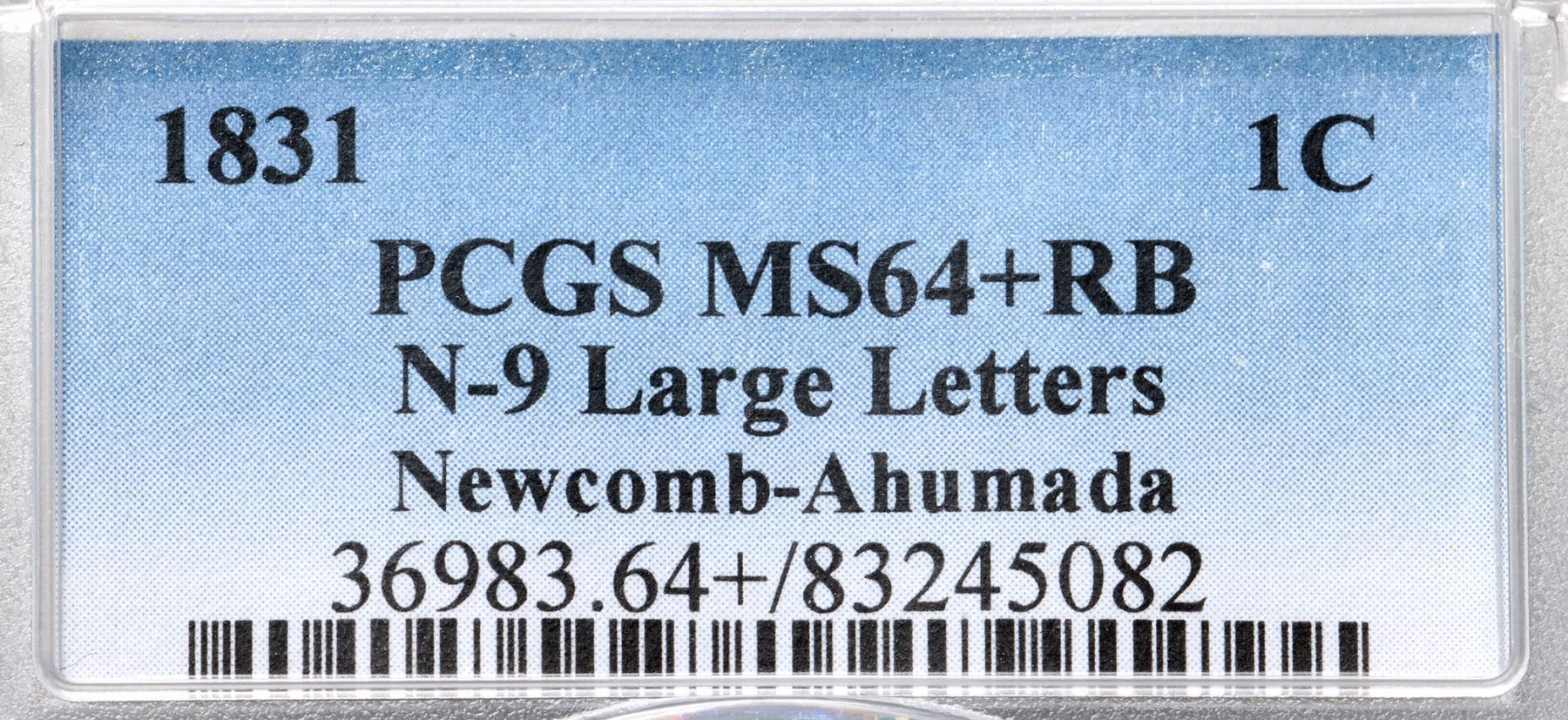 1831 N-9 R2 Large Letters, PCGS graded MS64+ Red & BrownFrosty medium brown and light chocolate with mint red covering 10% of the obverse while nearly half the reverse shows mint color. The surfaces are lustrous and the eye appeal is quite nice, but there are a few marks. The notable marks are a diagonal nick under the right corner of the eye, a spot of darker toning (not carbon) over the left side of the N in ONE, and a short trail of dull ticks near the leaf above that E. E-MDS, die state b. The obverse is cracked through the date and stars, as always, and there is an additional very fine crack from the left point of star 5 to the dentils. Nicely struck with radial lines in all the stars. A very nice cent. Graded MS63 and tied for CC#1 with one other examples in the Noyes census, his photo #27081. Our grade is MS62. Comes with an important provenance.Certificate Number: 36983.64+/83245082Pedigree: Ex Howard R. Newcomb, J. C. Morgenthau & Co., 5/16/1945:630-Floyd T. Starr, Stack's 6/13/1984:253 (as MS63)-John J. Nicholas, Jr., Superior 2/2/1992:564-Chris McCawley 9/1999-Manuel Ahumada Collection, McCawley & Grellman Auctions/Goldbergs 6/4/2017:120-Terry S. Denman Collection
