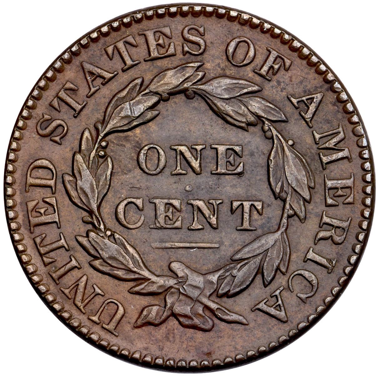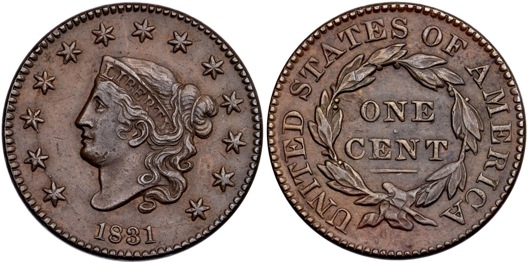 1831 N-9a R-2 VF35AU sharpness but there is a light layer of oxidation dulling the natural gloss, especially on the reverse, and scattered nicks and abrasions on the obverse. The most notable marks are a couple nicks behind the chin, a couple before the chin, and one below the gap between stars 6-7. Light chocolate and olive brown. EDS.Ex; Doug Durasoff