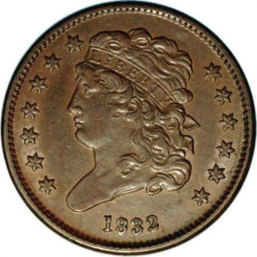 <B>1832<1/2 C> C-2, B-2, R.2. Die State 1. AU53 NGC. XF40 EAC.</B></I> Small date, small stars; Point of highest leaf below E. Perfect obverse and reverse dies. Recently, this variety has been dubbed the "Accessory S" variety, with the lower serif of a misplaced S trapped between the outer leaf tip and berry below and slightly left of the first S in STATES. This die characteristic was discovered by Ron Manley in August 1998. On his envelope, Jules Reiver identified this coin as part of the "Palmer Hoard," but we do not have any details of what this means. Considerable luster remains on both sides with medium to dark brown color, lighter near the borders. The wreath has a grayish-brown appearance.<BR><I>Ex: "Palmer Hoard;" Harold Bareford; William Bareford (5/25/1984).</B></I> Envelope Included.