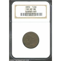 <TR><TD width="100%"><TABLE cellSpacing=1 cellPadding=3 width="100%" border=0><TBODY><TR><TD width="100%" bgColor=#79735c><FONT face=arial color=#ffffff size=3><B>Description</B> </FONT></TD></TR><TR><TD width="100%" bgColor=#ffffff><FONT face=arial size=2><B>1832 1/2 C MS62 Brown NGC.</B></I> B-1, C-1, R.2. A well struck half cent that does not have relevant contact marks, but the first star has minor verdigris. The obverse generally has pleasing chocolate-brown color, while the reverse has two-tone olive and lavender hues.<BR><I>From the Gary G. Walker Collection.</B></I> </FONT></TD></TR></TBODY></TABLE></TD></TR></TBODY></TABLE><BR><A name=PricesRealized></A><TABLE cellSpacing=0 cellPadding=0 width="100%" bgColor=#000000 border=0><TBODY><TR><TD width="100%"><TABLE cellSpacing=1 cellPadding=3 width="100%" border=0><TBODY><TR><TD width="100%" bgColor=#79735c><A name=PR><FONT face=arial color=#ffffff size=3><B>Previous Prices from Heritage Auctions</B> </FONT></A></TD></TR><TR><TD bgColor=#f6f6ed>No Prior Data Recorded </TD></TR><TR><TD bgColor=#ffffff><FONT face=arial size=1 ?>PLEASE NOTE: All prices realized reflect the final hammer price PLUS the buyer's premium in auctions that charge a buyer's premium. Each item has a notation at the top of the listing indicating whether that lot included a buyer's premium. Example: A item that sells with a final hammer price of $100 and a 20% buyer's premium will display with a price realized of $120. All information listed is intended to be as accurate as possible, but errors are possible. Please use this guide carefully and inform us of any inaccuracies. </FONT></TD></TR></TBODY></TABLE></TD></TR></TBODY></TABLE><BR><TABLE cellSpacing=0 cellPadding=0 width="100%" bgColor=#000000 border=0><TBODY><TR><TD width="100%"><TABLE cellSpacing=1 cellPadding=3 width="100%" border=0><TBODY><TR><TD width="100%" bgColor=#79735c colSpan=6><FONT face=arial color=#ffffff size=3><B>Price Guide*</B> </FONT></TD></TR><TR bgColor=#f6f6ed><TD align=middle><B>Grade</B> </TD><TD align=middle><B>Coin World<BR>(Trends)</B> </TD><TD align=middle><B>Numismedia<BR>Retail</B> </TD><TD align=middle><B>Numismedia<BR>Wholesale</B> </TD><TD align=middle><B>Coin<BR>Universe</B> </TD><TD align=middle><B>Heritage<BR>Value Index</B> </TD></TR><TR bgColor=#ffffff><TD align=middle>61</TD><TD align=right>---</TD><TD align=right>$240.00</TD><TD align=right>$200.00</TD><TD align=right>---</TD><TD align=right>$170.38</TD></TR><TR style="FONT-WEIGHT: bold" bgColor=#cccfdd><TD align=middle>62</TD><TD align=right>---</TD><TD align=right>$270.00</TD><TD align=right>$225.00</TD><TD align=right>$250.00</TD><TD align=right>$194.75</TD></TR><TR bgColor=#ffffff><TD align=middle>63</TD><TD align=right>---</TD><TD align=right>$331.00</TD><TD align=right>$265.00</TD><TD align=right>$350.00</TD><TD align=right>$246.25</TD></TR><TR bgColor=#ffffff><TD colSpan=6><FONT size=1>*All information listed is intended to be as accurate as possible, but errors are possible. No item may be returned or refused based on this information which is provided as a service to our customers. You should contact each pricing source directly to determine the accuracy of this information. </FONT></TD></TR></TBODY></TABLE></TD></TR></TBODY></TABLE><BR><TABLE cellSpacing=0 cellPadding=0 width="100%" bgColor=#000000 border=0><TBODY><TR><TD width="100%"><TABLE cellSpacing=1 cellPadding=3 width="100%" border=0><TBODY><TR><TD width="100%" bgColor=#79735c><FONT face=arial color=#ffffff size=3><B>Population Guide</B> </FONT></TD></TR><TR bgColor=#ffffff><TD align=middle><!-- Begin Output of Population Grid--><TABLE cellSpacing=0 cellPadding=0 width="100%" border=0><TBODY><TR><TD vAlign=center><TABLE cellSpacing=0 width="100%" border=1 cellsadding="3"><TBODY><TR><TD vAlign=center><TABLE cellSpacing=0 cellPadding=3 width="100%" border=1><TBODY><TR><TD vAlign=center align=middle bgColor=#f0f1e8 colSpan=2 <CENTER><FONT face=Arial size=2><B>PCGS Pop </B></FONT><CENTER></CENTER></TD><TD vAlign=center align=middle bgColor=#f0f1e8 colSpan=2><CENTER><FONT face=Arial size=2><B>NGC Pop</B></CENTER></FONT></TD></TR><TR><TD vAlign=center><FONT face=Arial size=2>(62)</FONT> </TD><TD vAlign=center align=right><FONT face=Arial size=2>11</FONT> </TD><TD vAlign=center><FONT face=Arial size=2>(62)</FONT> </TD><TD vAlign=center align=right><FONT face=Arial size=2>21</FONT> </TD></TR><TR><TD vAlign=center><FONT face=Arial size=2>(>62)</FONT> </TD><TD vAlign=center align=right><FONT face=Arial size=2>55</FONT> </TD><TD vAlign=center><FONT face=Arial size=2>(>62)</FONT> </TD><TD vAlign=center align=right><FONT face=Arial size=2>39</FONT> </TD></TR></TBODY></TABLE></TD></TR></TBODY></TABLE></TD></TR></TBODY></TABLE><!-- End Output of Population Grid--></TD></TR></TBODY></TABLE></TD></TR></TBODY></TABLE><BR><TABLE cellSpacing=0 cellPadding=0 width="100%" bgColor=#000000 border=0><TBODY><TR> Important notice: We expect to be auctioning lots at the rate of 200-250 per hour. On occasion eBay live bid software cannot keep up with the pace of the auctions where 4-5 lots per minute can hammer down, so we recommend that you place a realistic absentee bid now as insurance to avoid disappointment. Also please note that all Heritage/CAA lots purchased through eBay Live carry a 20% Buyer's Premium. Please make sure you read the Terms and Conditions.