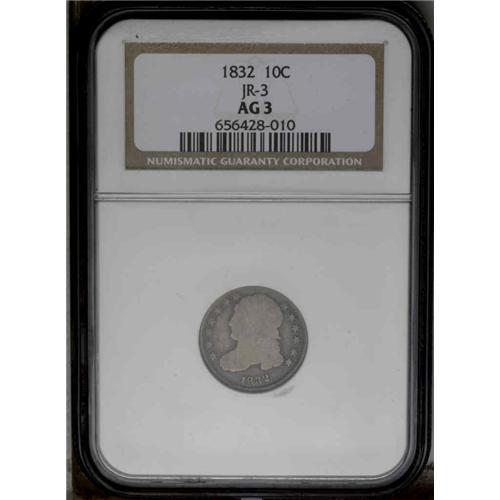 <B>1832<10C> JR-3, R.3. Reiver state c. AG3 NGC.</B></I> The obverse is toned a dark gray in the fields, much lighter silver on the devices, and similarly toned on the reverse. Excellent surfaces for the grade with nothing to report aside from a few stray scratches from circulation. The obverse has complete rims and stars while much of the left side of the reverse has worn away. On this late die state, there is a full cud connecting the final A of AMERICA to the two top arrowheads to the rim. A scarce and desirable die state in any grade. Envelope Included.