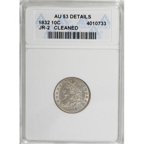 <B>1832 10C --Cleaned--ANACS. AU53 Details.</B></I> JR-2. NGC Census: (6/196). PCGS Population (15/171). Mintage: 522,500. Numismedia Wsl. Price for NGC/PCGS coin in AU53: $300. (#4521)<BR><BR><B>Coin Engraver:</B> John Reich<BR><BR><b>Shipping:</b> Coins & Currency (<a target="_blank" href="http://www.heritageauctions.com/common/shipping.php">view shipping information</a>)