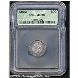 <B>1832<10C> AU58 ICG.</B></I> JR-1, R-2. Sea-green and rose-mauve hues embrace this sharply struck representative. The luster is nearly complete, and the only mark remotely worthy of mention crosses the eagle's left (facing) leg. <BR><BR><B>Important notice:</B> Heritage usually auctions material at the rate of 200-250 lots per hour. On some occasions eBay Live bid software or the Internet may not be able to keep up with the pace of the auction. We recommend placing a realistic absentee bid now as insurance to avoid disappointment. Occasionally the auctioneer may eliminate or reject an eBay Live bid, and the auctioneer may also reopen a lot after the close of the eBay live bidding (usually because we missed an audience bid), and may reject your bid even if it shows you as the winning bidder. By bidding via eBay Live, you agree that Heritage may award the lot to another bidder at its sole discretion under the circumstances described above or any other reasonable circumstances. Since eBay bids are not shown to us until we open the lot on the floor, we treat those bids just like floor bids. In most cases the floor responds before the eBay bid is presented to us, due to Internet lag time, so for consistency we have made it a policy that floor bids are always considered first over tie eBay live bids. Also please note that all Heritage lots purchased through eBay Live carry a 20% Buyer's Premium. Please make sure you read the Terms and Conditions before you bid.