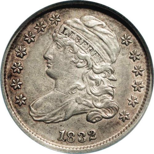 <B>1832<10C> JR-2, R.2. Reiver state a.--Improperly Cleaned--NCS. AU Details.</B></I> Cleaned and retoned with irregular toning on the edge, lighter silver to the centers. Sharply struck throughout. One minor scratch is found on Liberty's neck.<BR><I>Ex: Karp (July 1983).</B></I> Envelope Included.