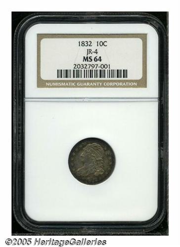 <B>1832<10C> MS64 NGC.</B></I> JR-4, R.3. Dove-gray, rose-gold, and russet-brown colors deepen toward the margins. Lustrous and assertively struck. A faint handling mark near the chin denies assessment as a Gem. As of (4/05), NGC has certified a mere two examples as JR-4, this piece, and a second as AU58.<BR><I>From the Dr. Kurt Peters Collection.</B></I> From the Dr. Kurt Peters Collection.