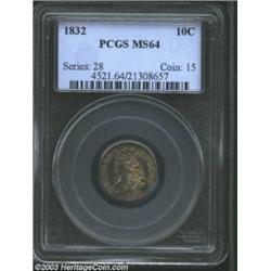 <TABLE cellSpacing=0 cellPadding=0 width="100%" bgColor=#000000 border=0><TBODY><TR><TD width="100%"><TABLE cellSpacing=1 cellPadding=3 width="100%" border=0><TBODY><TR><TD width="100%" bgColor=#79735c><FONT face=arial color=#ffffff size=3><B>Description</B> </FONT></TD></TR><TR><TD width="100%" bgColor=#ffffff><FONT face=arial size=2><B>1832 10C MS64 PCGS.</B></I> JR-2, R.2. The seventh star points to the curl below the cap, and the first A in AMERICA is centered above UM in UNUM. Rich sea-green patina dominates both sides, although the left obverse field has blushes of ruby-red and navy-blue colors. A needle-sharp near-Gem with moderate luster and exceptional surfaces for the grade. Population: 28 in 64, 17 finer (8/03). </FONT></TD></TR></TBODY></TABLE></TD></TR></TBODY></TABLE><BR><A name=PricesRealized></A><TABLE cellSpacing=0 cellPadding=0 width="100%" bgColor=#000000 border=0><TBODY><TR><TD width="100%"><TABLE cellSpacing=1 cellPadding=3 width="100%" border=0><TBODY><TR><TD width="100%" bgColor=#79735c><A name=PR><FONT face=arial color=#ffffff size=3><B>Previous Prices from Heritage Auctions</B> </FONT></A></TD></TR><TR><TD bgColor=#f6f6ed><TABLE cellSpacing=0 cellPadding=0 width="100%" border=1><TBODY><TR><TD align=middle width="33%"><B>Date</B></TD><TD align=middle width="33%"><B>Service</B></TD><TD align=middle width="33%"><B>Price</B></TD></TR><TR bgColor=whitesmoke><TD width="33%"><B>03/21/2002</B></TD><TD width="33%">PCGS</TD><TD width="33%">$2,070.00</TD></TR><TR bgColor=whitesmoke><TD width="33%"><B>02/01/1998</B></TD><TD width="33%">PCGS</TD><TD width="33%">$1,815.00</TD></TR><TR bgColor=whitesmoke><TD width="33%"><B>04/11/1997</B></TD><TD width="33%">NGC</TD><TD width="33%">$1,320.00</TD></TR><TR bgColor=whitesmoke><TD width="33%"><B>06/01/1998</B></TD><TD width="33%">NGC</TD><TD width="33%">$1,760.00</TD></TR></TBODY></TABLE></TD></TR><TR><TD bgColor=#ffffff><FONT face=arial size=1 ?>PLEASE NOTE: All prices realized reflect the final hammer price PLUS the buyer's premium in auctions that charge a buyer's premium. Each item has a notation at the top of the listing indicating whether that lot included a buyer's premium. Example: A item that sells with a final hammer price of $100 and a 20% buyer's premium will display with a price realized of $120. All information listed is intended to be as accurate as possible, but errors are possible. Please use this guide carefully and inform us of any inaccuracies. </FONT></TD></TR></TBODY></TABLE></TD></TR></TBODY></TABLE><BR><TABLE cellSpacing=0 cellPadding=0 width="100%" bgColor=#000000 border=0><TBODY><TR><TD width="100%"><TABLE cellSpacing=1 cellPadding=3 width="100%" border=0><TBODY><TR><TD width="100%" bgColor=#79735c colSpan=6><FONT face=arial color=#ffffff size=3><B>Price Guide*</B> </FONT></TD></TR><TR bgColor=#f6f6ed><TD align=middle><B>Grade</B> </TD><TD align=middle><B>Coin World<BR>(Trends)</B> </TD><TD align=middle><B>Numismedia<BR>Retail</B> </TD><TD align=middle><B>Numismedia<BR>Wholesale</B> </TD><TD align=middle><B>Coin<BR>Universe</B> </TD><TD align=middle><B>Heritage<BR>Value Index</B> </TD></TR><TR bgColor=#ffffff><TD align=middle>63</TD><TD align=right>$1,200.00</TD><TD align=right>---</TD><TD align=right>$1,100.00</TD><TD align=right>$1,450.00</TD><TD align=right>$860.63</TD></TR><TR style="FONT-WEIGHT: bold" bgColor=#cccfdd><TD align=middle>64</TD><TD align=right>$2,100.00</TD><TD align=right>---</TD><TD align=right>$1,825.00</TD><TD align=right>$2,850.00</TD><TD align=right>$1,806.25</TD></TR><TR bgColor=#ffffff><TD align=middle>65</TD><TD align=right>$5,750.00</TD><TD align=right>---</TD><TD align=right>$4,275.00</TD><TD align=right>$6,750.00</TD><TD align=right>$4,401.67</TD></TR><TR bgColor=#ffffff><TD colSpan=6><FONT size=1>*All information listed is intended to be as accurate as possible, but errors are possible. No item may be returned or refused based on this information which is provided as a service to our customers. You should contact each pricing source directly to determine the accuracy of this information. </FONT></TD></TR></TBODY></TABLE></TD></TR></TBODY></TABLE><BR><TABLE cellSpacing=0 cellPadding=0 width="100%" bgColor=#000000 border=0><TBODY><TR><TD width="100%"><TABLE cellSpacing=1 cellPadding=3 width="100%" border=0><TBODY><TR><TD width="100%" bgColor=#79735c><FONT face=arial color=#ffffff size=3><B>Population Guide</B> </FONT></TD></TR><TR bgColor=#ffffff><TD align=middle><!-- Begin Output of Population Grid--><TABLE cellSpacing=0 cellPadding=0 width="100%" border=0><TBODY><TR><TD vAlign=center><TABLE cellSpacing=0 width="100%" border=1 cellsadding="3"><TBODY><TR><TD vAlign=center><TABLE cellSpacing=0 cellPadding=3 width="100%" border=1><TBODY><TR><TD vAlign=center align=middle bgColor=#f0f1e8 colSpan=2 <CENTER><FONT face=Arial size=2><B>PCGS Pop </B></FONT><CENTER></CENTER></TD><TD vAlign=center align=middle bgColor=#f0f1e8 colSpan=2><CENTER><FONT face=Arial size=2><B>NGC Pop</B></CENTER></FONT></TD></TR><TR><TD vAlign=center><FONT face=Arial size=2>(64)</FONT> </TD><TD vAlign=center align=right><FONT face=Arial size=2>28</FONT> </TD><TD vAlign=center><FONT face=Arial size=2>(64)</FONT> </TD><TD vAlign=center align=right><FONT face=Arial size=2>31</FONT> </TD></TR><TR><TD vAlign=center><FONT face=Arial size=2>(>64)</FONT> </TD><TD vAlign=center align=right><FONT face=Arial size=2>17</FONT> </TD><TD vAlign=center><FONT face=Arial size=2>(>64)</FONT> </TD><TD vAlign=center align=right><FONT face=Arial size=2>14</FONT> </TD></TR></TBODY></TABLE></TD></TR></TBODY></TABLE></TD></TR></TBODY></TABLE><!-- End Output of Population Grid--> Important notice: Heritage usually auctions material at the rate of 200-250 lots per hour. On some occasions eBay Live bid software or the Internet may not be able to keep up with the pace of the auction. We recommend placing a realistic absentee bid now as insurance to avoid disappointment. Occasionally the auctioneer may eliminate or reject an eBay Live bid, 