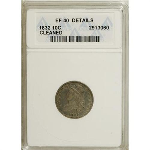 <B>1832 10C --Cleaned--ANACS. XF40 Details.</B></I> NGC Census: (3/212). PCGS Population (11/212). Mintage: 522,500. Numismedia Wsl. Price for NGC/PCGS coin in XF40: $200. (#4521)<BR><BR><B>Coin Engraver:</B> John Reich<BR><BR><b>Shipping:</b> Coins & Currency (<a target="_blank" href="http://www.heritageauctions.com/common/shipping.php">view shipping information</a>\)