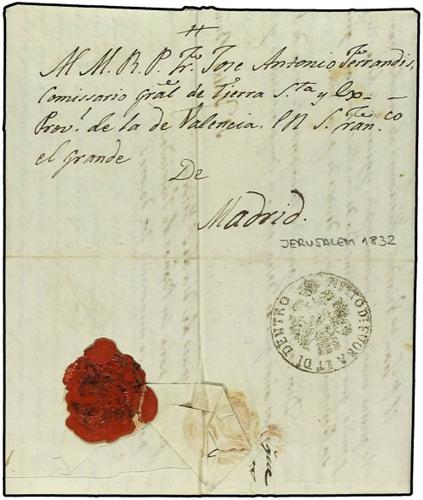 1832 (13-Mayo) JERUSALEM a MADRID. Carta enviada por un Fraile Franciscano al Procurador General de Tierra Santa en Madrid, circulada por el CORREO ESPAÑOL DEL LEVANTE, indicación en el texto interior "Por los conductores que partieron de Jaffa...". Marca al dorso de desinfección NETTO DI FUORA ET DI DENTRO. RARISIMA.