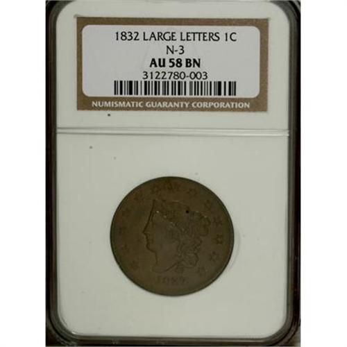 <B>1832 1C Large Letters AU58 NGC.</B></I> N-3. NGC Census: (13/48). PCGS Population (7/29). Mintage: 2,362,000. Numismedia Wsl. Price for NGC/PCGS coin in AU58: $208. (#1687)<BR><BR><B>Coin Engraver:</B> Robert Scot or John Reich<BR><BR><b>Shipping:</b> Coins & Currency (<a target="_blank" href="http://www.heritageauctions.com/common/shipping.php">view shipping information</a>)