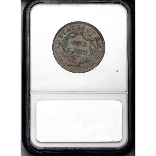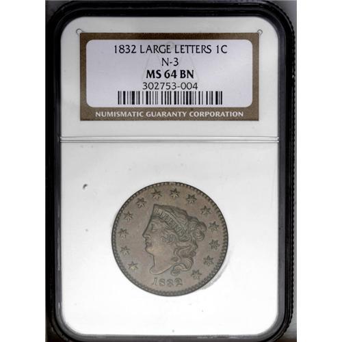 <B>1832<1C> Large Letters MS64 Brown NGC.</B></I> N-3, R.1. The boldly recut T in CENT identifies this collectible Newcomb marriage. Crisply struck save for a few left side stars, and the lustrous golden-brown and steel-blue surfaces are refreshingly smooth. EAC 60. <BR><BR><B>Important notice:</B> Heritage usually auctions material at the rate of 200-250 lots per hour. On some occasions eBay Live bid software or the Internet may not be able to keep up with the pace of the auction. We recommend placing a realistic absentee bid now as insurance to avoid disappointment. Occasionally the auctioneer may eliminate or reject an eBay Live bid, and the auctioneer may also reopen a lot after the close of the eBay live bidding (usually because we missed an audience bid), and may reject your bid even if it shows you as the winning bidder. By bidding via eBay Live, you agree that Heritage may award the lot to another bidder at its sole discretion under the circumstances described above or any other reasonable circumstances. Since eBay bids are not shown to us until we open the lot on the floor, we treat those bids just like floor bids. In most cases the floor responds before the eBay bid is presented to us, due to Internet lag time, so for consistency we have made it a policy that floor bids are always considered first over tie eBay live bids. Also please note that all Heritage lots purchased through eBay Live carry a 20% Buyer's Premium. Please make sure you read the Terms and Conditions before you bid. This lot is being auctioned in conjunction with a live floor auction by Heritage Galleries & Auctioneers. All final auction and invoice information will be supplied by Heritage Galleries & Auctioneers, and all other information should be considered preliminary. Lot:281 <BR><BR><B>Winning Notification and Billing:</B> After the FINAL session in this auction is complete, Heritage will send e-mail and snail mail invoices. This process normally takes several days. All final auction and invoice information will be supplied by Heritage Galleries & Auctioneers, and all other information should be considered preliminary. <BR><BR>This auction will be conducted on a live auction floor and over the Internet through eBay Live. If you choose to place an absentee bid, please take a moment to <font color='#0000ff'><u><a href='http://pages.ebay.com/liveauctions/help/before/laabsentee.html'>learn how eBay Live absentee bidding works</a></u></font><font color='#000000'>