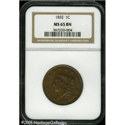 <B>1832 1C Large Letters MS65 Brown NGC.</B></I> N-2, Low R.3. The obverse has a crack joining stars 5 through 10. The obverse also has extensive die flowlines extending the stars to the border. Recutting is noted at ED ST on the reverse legend. An exceptionally smooth example showing good detail in the central regions. Each side presents a medium tan-brown color with glimmers of mint red in selected crevices. Population: 7 in 65, 2 finer (12/04).<BR><I>From The Richard J. Chouinard Collection of United States Coins, Part Two.</B></I> Lot:5142