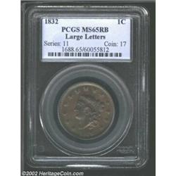 1832 1C Large Letters MS65 Red and Brown PCGS. Sharply struck throughout, the surfaces are evenly me