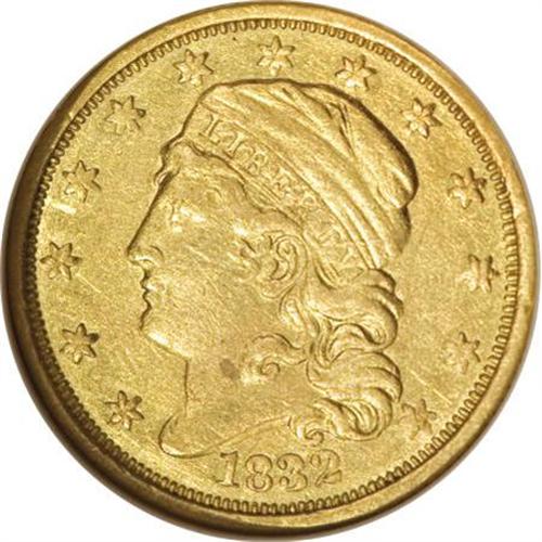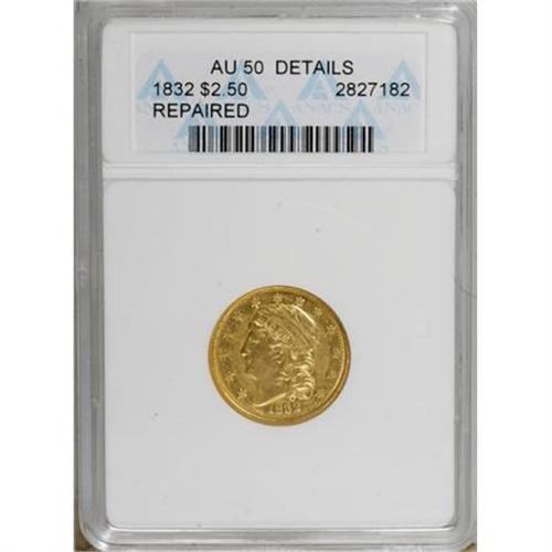 <B>1832 $2 1/2 --Repaired--ANACS. AU50 Details.</B></I> Breen-6135, BD-1, R.4. The only known dies, identified by the recut U in UNITED and a high 1 in the date. The present piece is carefully repaired on the open fields, and the portrait appears gently whizzed. Nonetheless, luster brightens the stars and legends, and the eagle's plumage is boldly defined.<BR><BR><b>Shipping:</b> Coins & Currency (<a target="_blank" href="http://www.heritageauctions.com/common/shipping.php">view shipping information</a>)