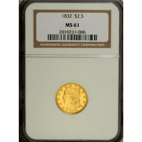 <B>1832 $2 1/2 MS61 NGC.</B></I> Breen-6135, BD-1, R.4. The striking details are much sharper than often encountered on this Capped Head Left issue, the only noticeable softness being found on the curls over Liberty's ear. Glimmering semi-reflective fields are typical of the few better grade survivors of this heavily melted, low mintage issue. A faint hairline facial blemish effectively limits the grade. Census: 6 in 61, 10 finer (12/06).<BR><BR><b>Shipping:</b> Coin/Currency (<a target="_blank" href="http://www.heritageauctions.com/common/shipping.php">view shipping information</a>)