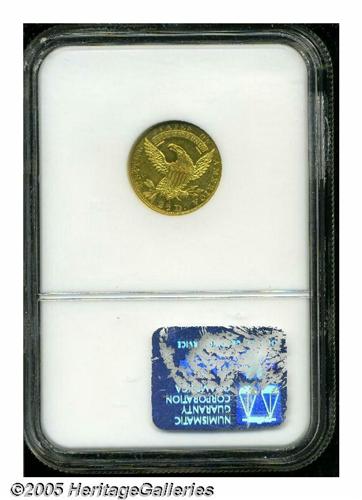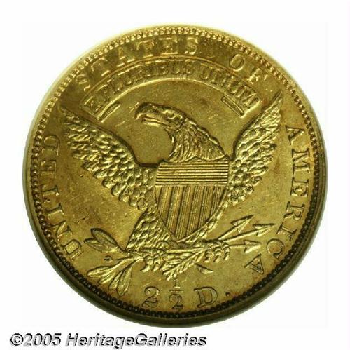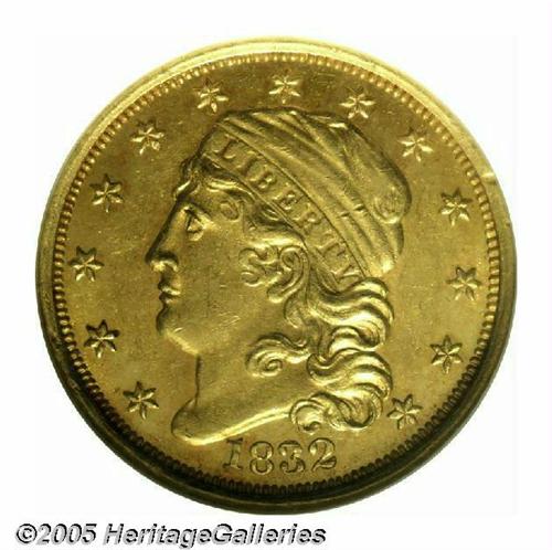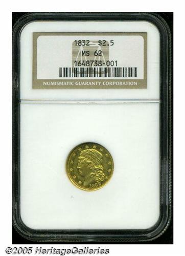 <B>1832<$2 1/2> MS62 NGC.</B></I> Only one die pair was used to strike 1832 Quarter Eagles, which does not come as a surprise since a mere 4,400 pieces were recorded as struck. Early Quarter Eagles, like all pre-1834 gold coins, have a low survival rate since their contemporary bullion value exceeded face. NGC has certified only 32 examples in all grades, and duplicate submissions are likely. The present piece has lovely apricot color and extensive bright luster. The strike is very sharp, since only a trace of weakness is encountered on the left vertical shield lines. Further, the absence of relevant marks confirms the quality and desirability of this rare date example. Population: 4 in 62, 7 finer (4/05).