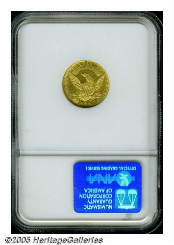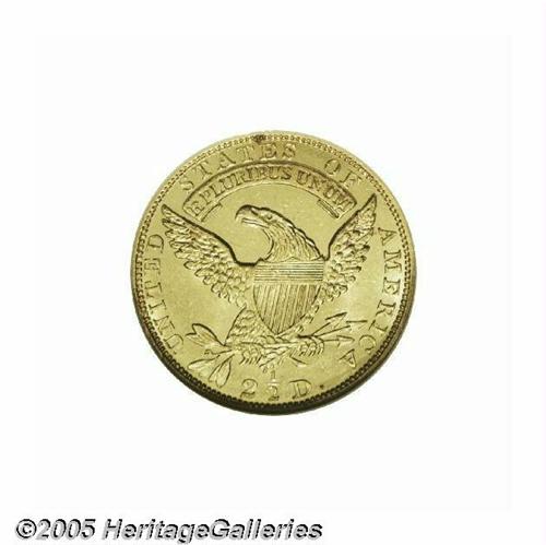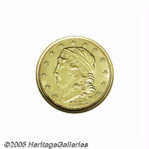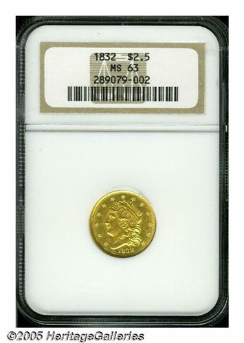 <B>1832<$2 1/2> MS63 NGC.</B></I> Breen-6135, Bass-3029, R.4, the only die pairing. Among the finest certified survivors of this issue, the present coin shares the MS63 level with only seven other coins between both major grading services (6/05), one is finer at NGC. A bright, semi-prooflike coin, the green-gold surfaces show a fully lustrous appearance overall. Both sides are typically marked for the grade, and a tiny black spot on the rim between the TE of STATES is the only noticeable pedigree marker. With razor sharp striking definition and outstanding eye appeal for the issue, this coin would do justice to any gold collection.<BR> With a low mintage of 4,400 pieces, it is little wonder that the 1832 is a rare find in any grade. According to Akers, a surviving population estimate of 200 pieces is too optimistic given the infrequency with which examples appear on the market. At the MS63 level, the "small handful [that] exist in this quality range" appear so sporadically as to underscore the importance of the present lot.