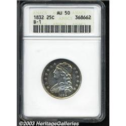 1832 25C AU50 ANACS. B-1, R.1. The center of the obverse is a bright silver-gray, while the balance of the coin is highlighted in russet and sea-green toning. This flashy survivor has some isolated softness on the central devices and retains more than the expected degree of luster. Important notice: Heritage usually auctions material at the rate of 200-250 lots per hour. On some occasions eBay Live bid software or the Internet may not be able to keep up with the pace of the auction. We recommend placing a realistic absentee bid now as insurance to avoid disappointment. Occasionally the auctioneer may eliminate or reject an eBay Live bid, and the auctioneer may also reopen a lot after the close of the eBay live bidding (usually because we missed an audience bid), and may reject your bid even if it shows you as the winning bidder. By bidding via eBay Live, you agree that Heritage may award the lot to another bidder at its sole discretion under the circumstances described above or any other reasonable circumstances. Also please note that all Heritage lots purchased through eBay Live carry a 20% Buyer's Premium. Please make sure you read the Terms and Conditions before you bid.