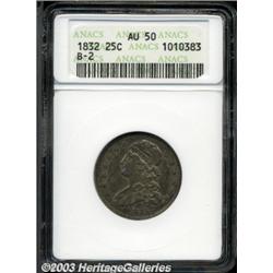 1832 25C AU50 ANACS. B-2, R.2. The glossy lilac-gray and steel-blue surfaces have a somewhat muted appearance, but show balanced wear and few appreciable blemishes. Important notice: Heritage usually auctions material at the rate of 200-250 lots per hour. On some occasions eBay Live bid software or the Internet may not be able to keep up with the pace of the auction. We recommend placing a realistic absentee bid now as insurance to avoid disappointment. Occasionally the auctioneer may eliminate or reject an eBay Live bid, and the auctioneer may also reopen a lot after the close of the eBay live bidding (usually because we missed an audience bid), and may reject your bid even if it shows you as the winning bidder. By bidding via eBay Live, you agree that Heritage may award the lot to another bidder at its sole discretion under the circumstances described above or any other reasonable circumstances. Also please note that all Heritage lots purchased through eBay Live carry a 20% Buyer's Premium. Please make sure you read the Terms and Conditions before you bid.