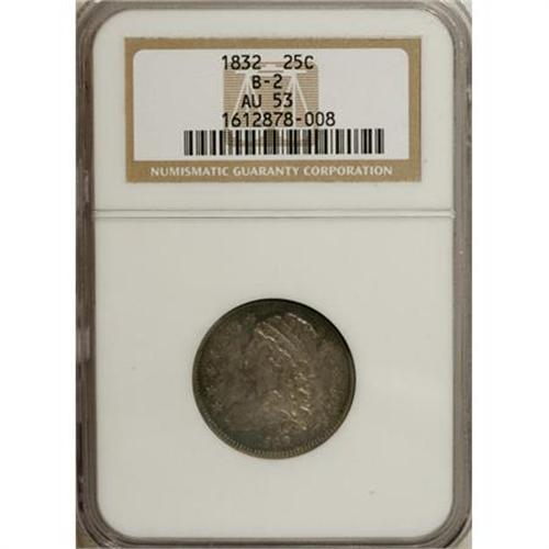 <B>1832 25C AU53 NGC.</B></I> B-2. NGC Census: (4/64). PCGS Population (8/70). Mintage: 320,000. Numismedia Wsl. Price for NGC/PCGS coin in AU53: $565. (#5351)<BR><BR><B>Coin Engraver:</B> William Kneass<BR><BR><b>Shipping:</b> Coins & Currency (<a target="_blank" href="http://www.heritageauctions.com/common/shipping.php">view shipping information</a>\)