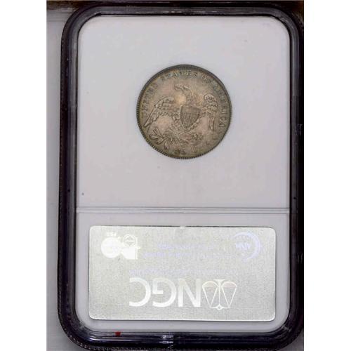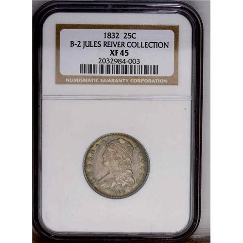 <B>1832<25C> B-2, R.2. XF45 NGC. Usual Die State.</B></I> Star 7 points to lower curl; 25 centered. Dark steel gray with iridescent toning around the periphery and very pleasing. The surfaces show scattered nicks and we note a minor scratch on the left wing of the eagle which extends to the field below. The coins from this die pairing all show the minor die crack through the last three obverse stars.<BR><I>Ex: Bowers and Merena (11/1984), lot 508; Jim McGuigan (12/1984).</B></I> Envelope Included.