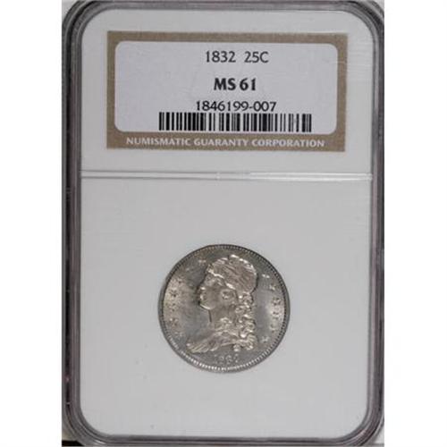 <B>1832 25C MS61 NGC.</B></I> B-1, R.2. The reverse has large arrowheads that almost reach the rim. This shining, minimally toned example offers excellent definition overall and surprisingly few abrasions, though light, wispy marks are present in the fields.<BR><BR><B>Coin Engraver:</B> William Kneass<BR><BR><b>Shipping:</b> Coins & Currency (<a target="_blank" href="http://www.heritageauctions.com/common/shipping.php">view shipping information</a>)