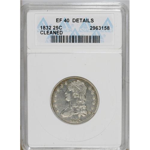 <B>1832 25C --Cleaned--ANACS. XF40 Details.</B></I> NGC Census: (2/79). PCGS Population (8/0). Mintage: 320,000. Numismedia Wsl. Price for NGC/PCGS coin in XF40: $267. (#5351)<BR><BR><b>Shipping:</b> Coins & Currency (<a target="_blank" href="http://www.heritageauctions.com/common/shipping.php">view shipping information</a>)