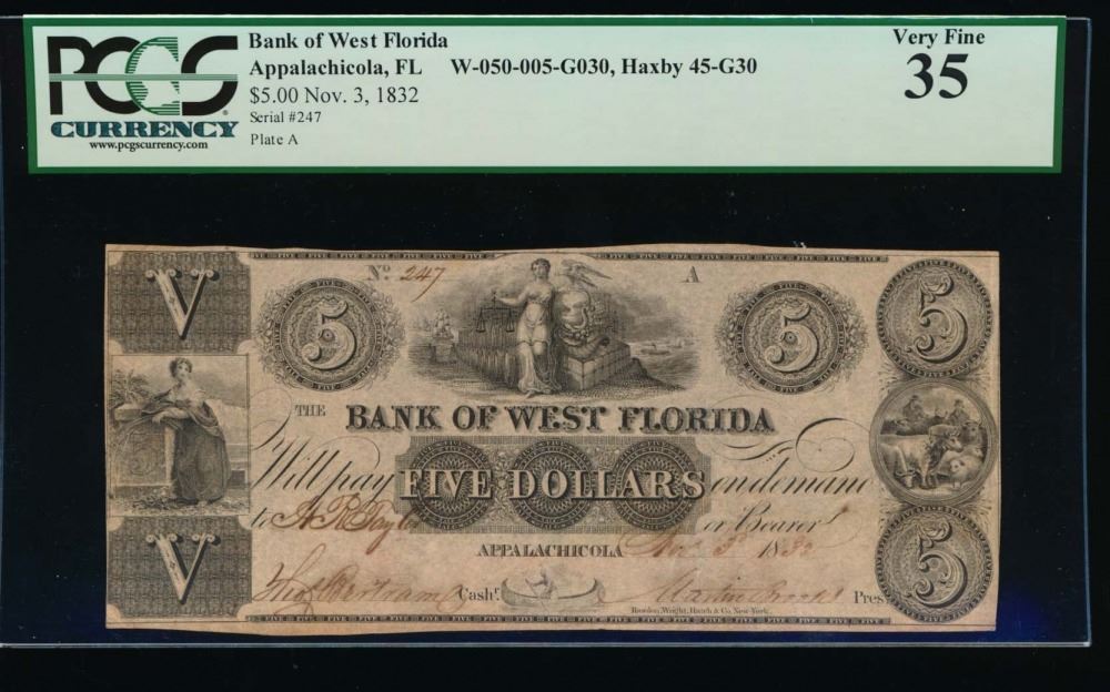 One 1832 $5 Bank of West Florida Obsolete Note PCGS 35.