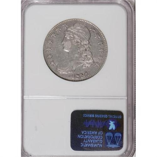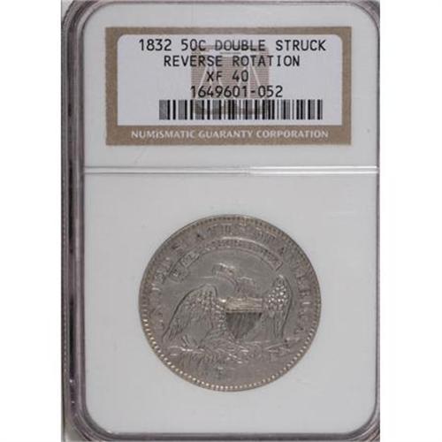 <B>1832 50C Small Letters--Double Struck, Reverse Rotation--XF40 NGC.</B></I> O-103, R.1. The reverse (hammer) die rotated between strikes, while the obverse (anvil) die remained stationary. The rotation is approximately 10 degrees counter-clockwise, relative to the reverse. Both sides have a reverse field, as made and presumably due to pressure from the open collar die. Untoned and well defined with no detracting marks.<BR><BR><B>Coin Engraver:</B> John Reich<BR><BR><b>Shipping:</b> Coins & Currency (<a target="_blank" href="http://www.heritageauctions.com/common/shipping.php">view shipping information</a>)