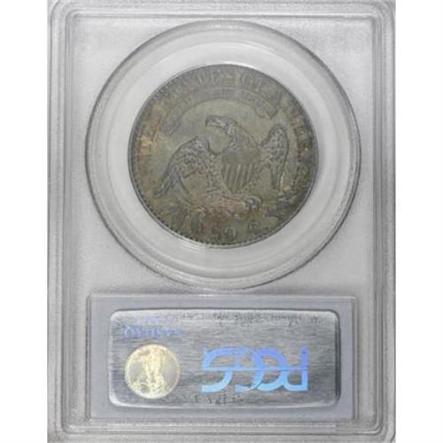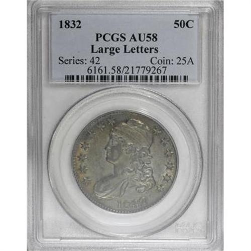 <B>1832 50C Large Letters AU58 PCGS.</B></I> O-101a, R.1. A smooth representative of the sole Large Letters variety for the date, although the dramatic die break beneath the left (facing) wing is perhaps of equal numismatic interest. Apple-green and golden-brown endow this satiny and attractive half dollar.<BR><BR><B>Coin Engraver:</B> John Reich<BR><BR><b>Shipping:</b> Coins & Currency (<a target="_blank" href="http://www.heritageauctions.com/common/shipping.php">view shipping information</a>)