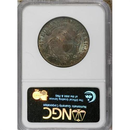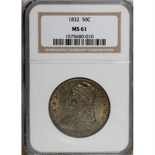 <B>1832 50C Large Letters MS61 NGC.</B></I> O-101a, R.1. The sole Large Letters variety for the date, but the prominent die break from the left (facing) wing to the branch is also diagnostic. Smooth blue-green and rose-gold fields encompass the gunmetal-gray devices. Struck from a lightly rusted reverse die.<BR><BR><B>Coin Engraver:</B> John Reich<BR><BR><b>Shipping:</b> Coins & Currency (<a target="_blank" href="http://www.heritageauctions.com/common/shipping.php">view shipping information</a>)