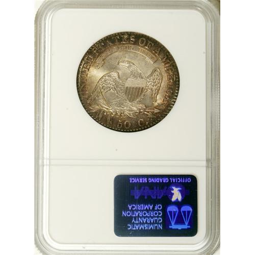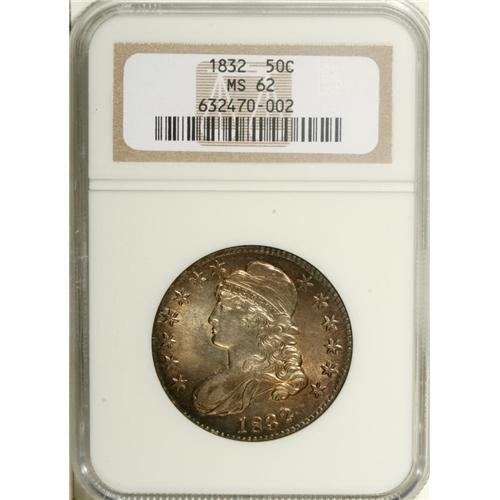 <B>1832 50C Large Letters MS62 NGC.</B></I> O-101, R.1. A lustrous and smooth representative of the sole Large Letters variety for the date, although the dramatic die break beneath the left (facing) wing is perhaps of equal numismatic interest. Sea-green and plum grace the borders, while the centers are nearly untoned.<BR><I>From The Rocky Top Collection of Bust Half Dollars.</B></I><BR><BR><b>Shipping:</b> Coins & Currency (<a target="_blank" href="http://www.heritageauctions.com/common/shipping.php">view shipping information</a>)