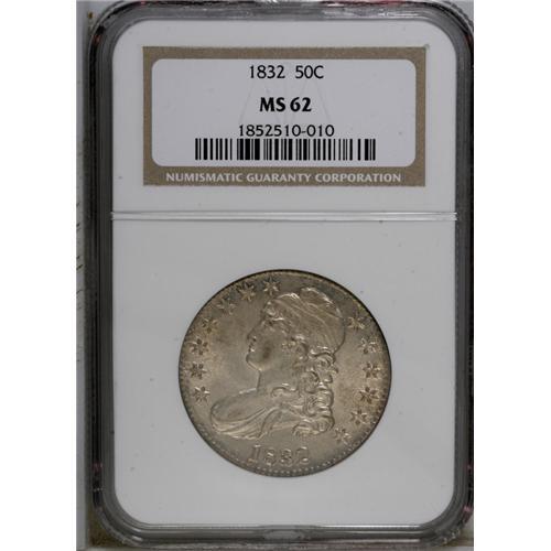 <B>1832<50C> Large Letters MS62 NGC.</B></I> O-101a, R.1. The heavy reverse die break makes this one of the easiest Bust halves to identify. Nicely struck with pleasing luster. Light golden patina appears in the fields, and a spot of dark red patina is noted on the cheek.