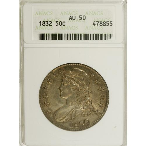 <B>1832 50C Small Letters AU50 ANACS.</B></I> NGC Census: (96/1006). PCGS Population (131/736). Mintage: 4,797,000. Numismedia Wsl. Price: $225. (#6160)<BR><BR><b>Shipping:</b> Coins & Currency (<a target="_blank" href="http://www.heritageauctions.com/common/shipping.php">view shipping information</a>)